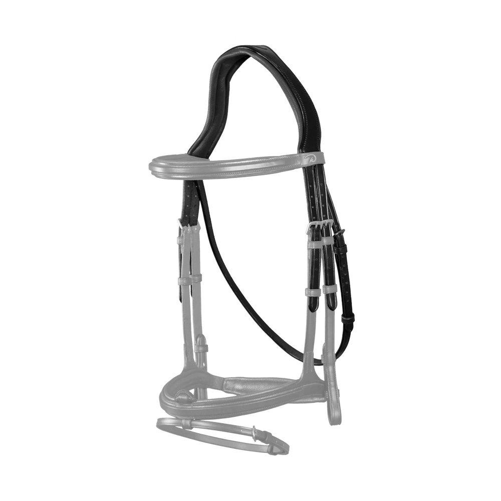Die tiefere Platzierung des Stirnriemens am Genickstück vermeidet Druck am Ohrenansatz. Dy'on zielt darauf ab, Druck auf diesen empfindlichen Bereich des Pferdekopfes zu vermeiden. Dieses Designmerkmal kann zu einem angenehmeren Erlebnis für das Pferd beitragen und das Risiko von Unbehagen oder Irritationen reduzieren. Dieses Ersatzteil ist mit einem Kehlriemen ausgestattet.
