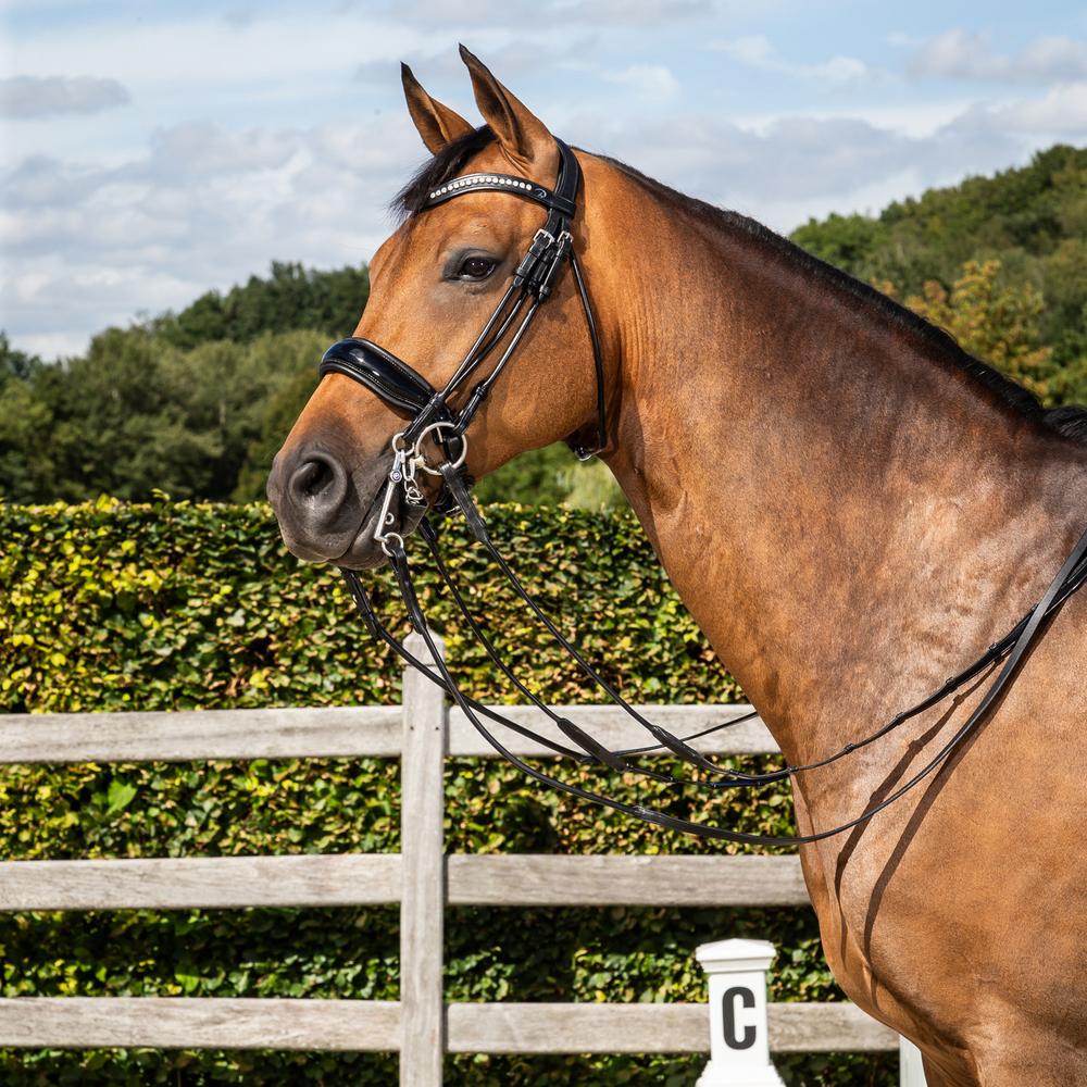 Patent Large Crank Noseband Double Bridle Supple V-shaped browband decorated with genuine Swarovski crystals Supple anatomical 38 mm wide noseband Noseband available in matte leather, patent leather, or patent leather with white lining Pull-back closure mounted on a padded protective backing