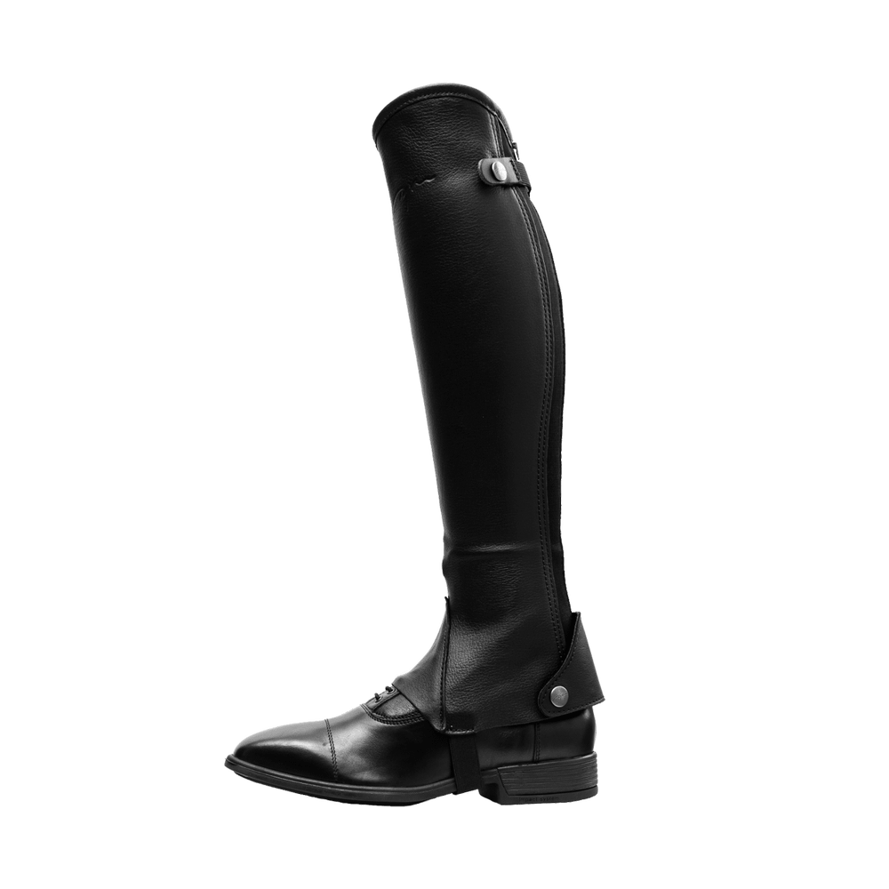 Half chaps in supple full grained leather (Thickness 1.6 mm) with nylon YKK zip fastener and elastic behind calf. Unique design with safety guard zip fastener and elastic strap under the knee. The Classic half chaps exist in standard size