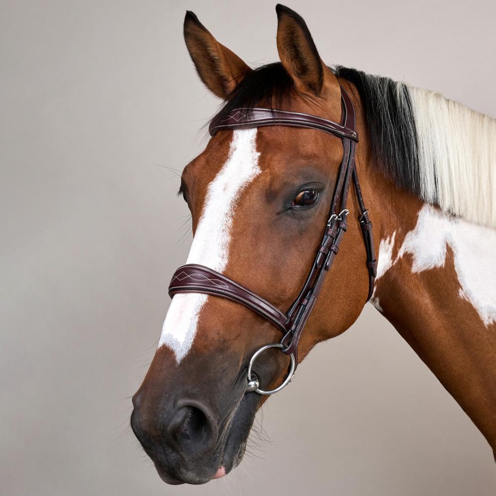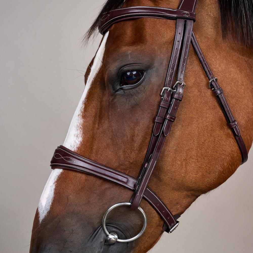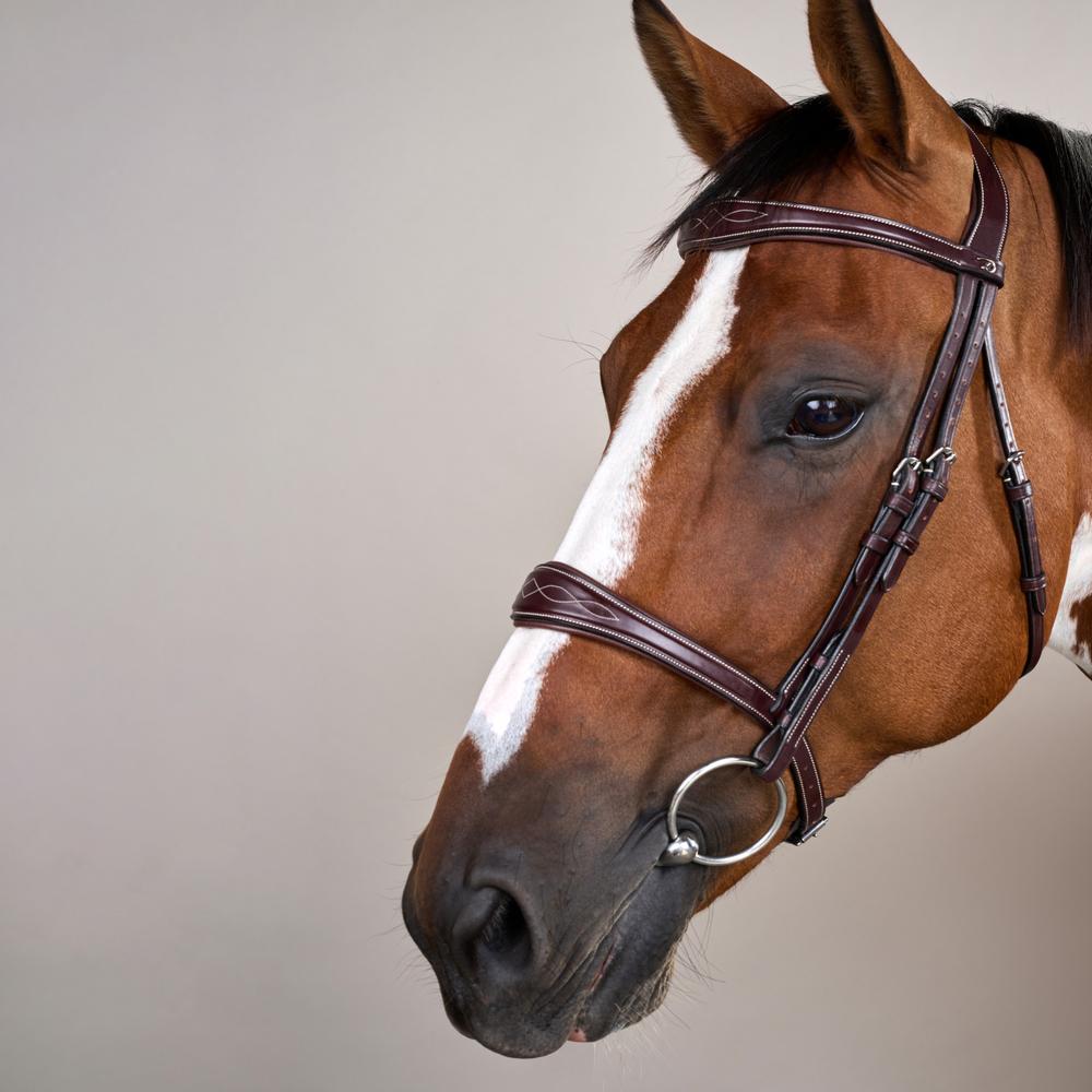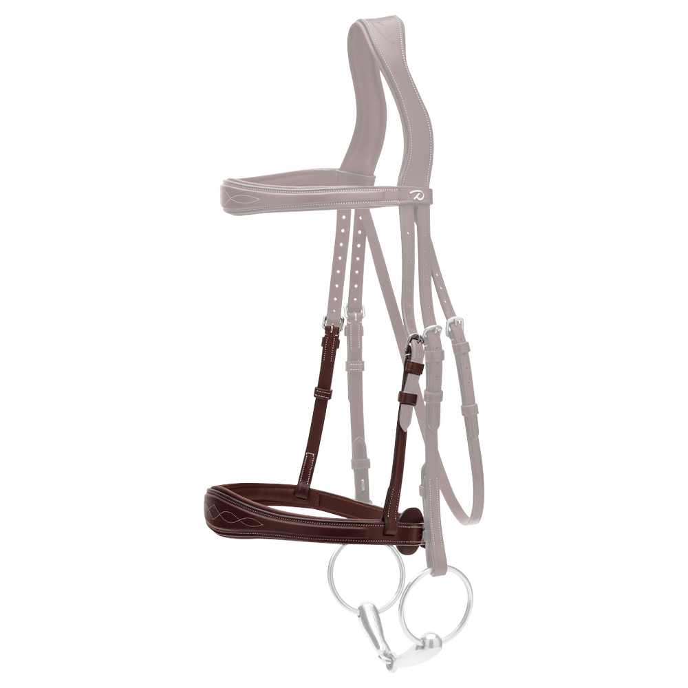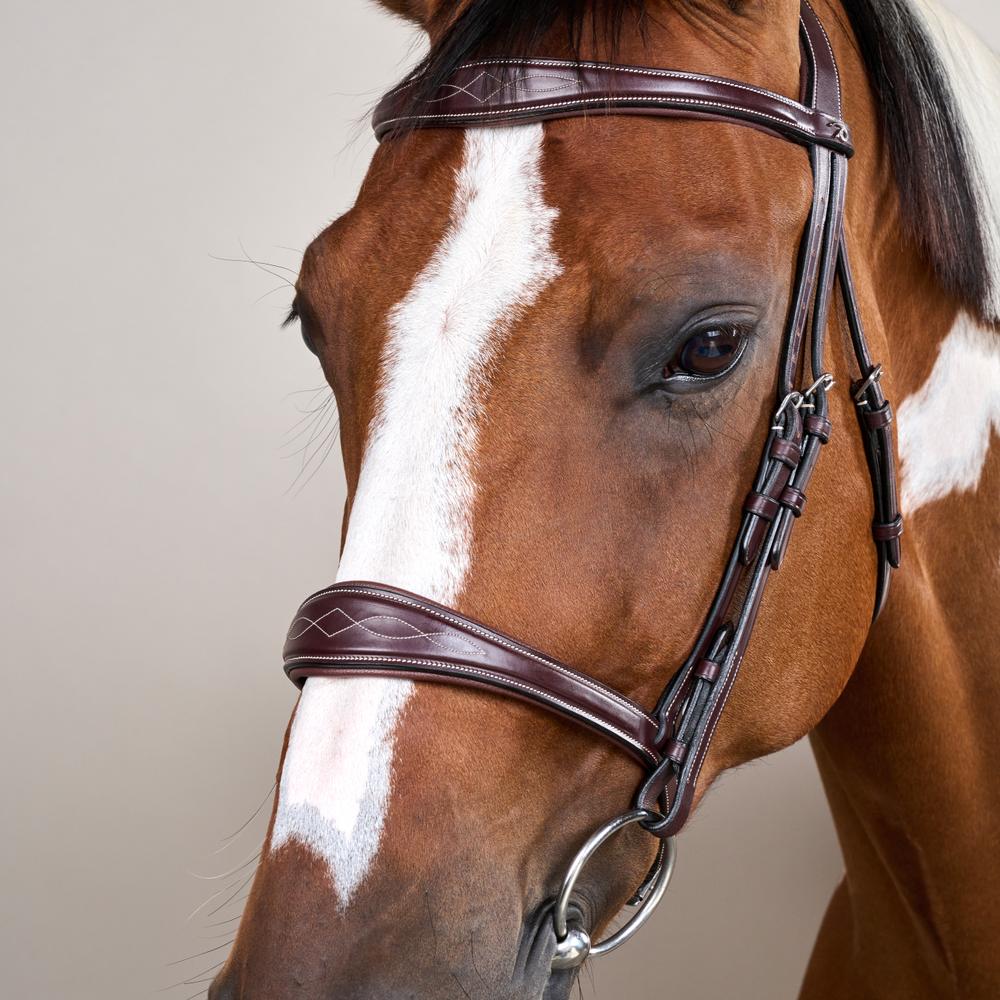 Leicht quadratisch erhöhter anatomischer Nasenriemen, der in der Mitte verbreitert ist und mit dekorativen Ziernähten versehen ist. Kann an die Trensen der US-Jumping-Kollektion angepasst werden.