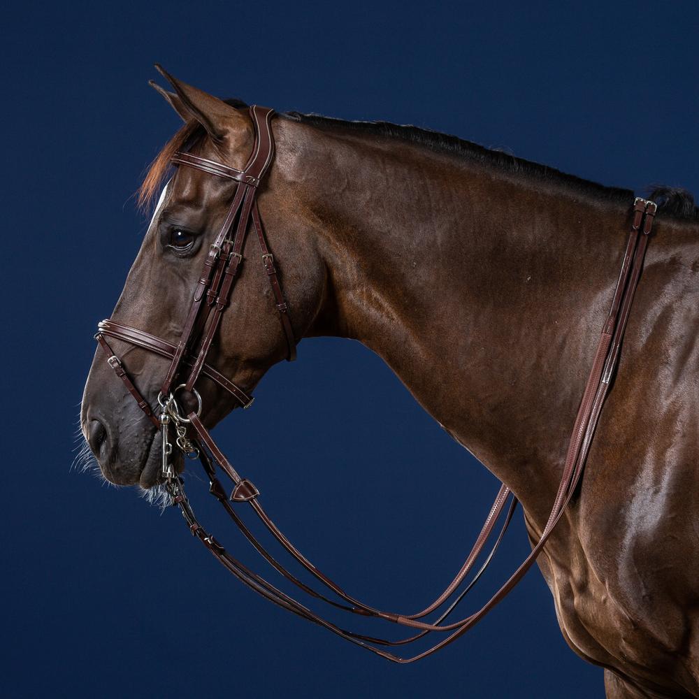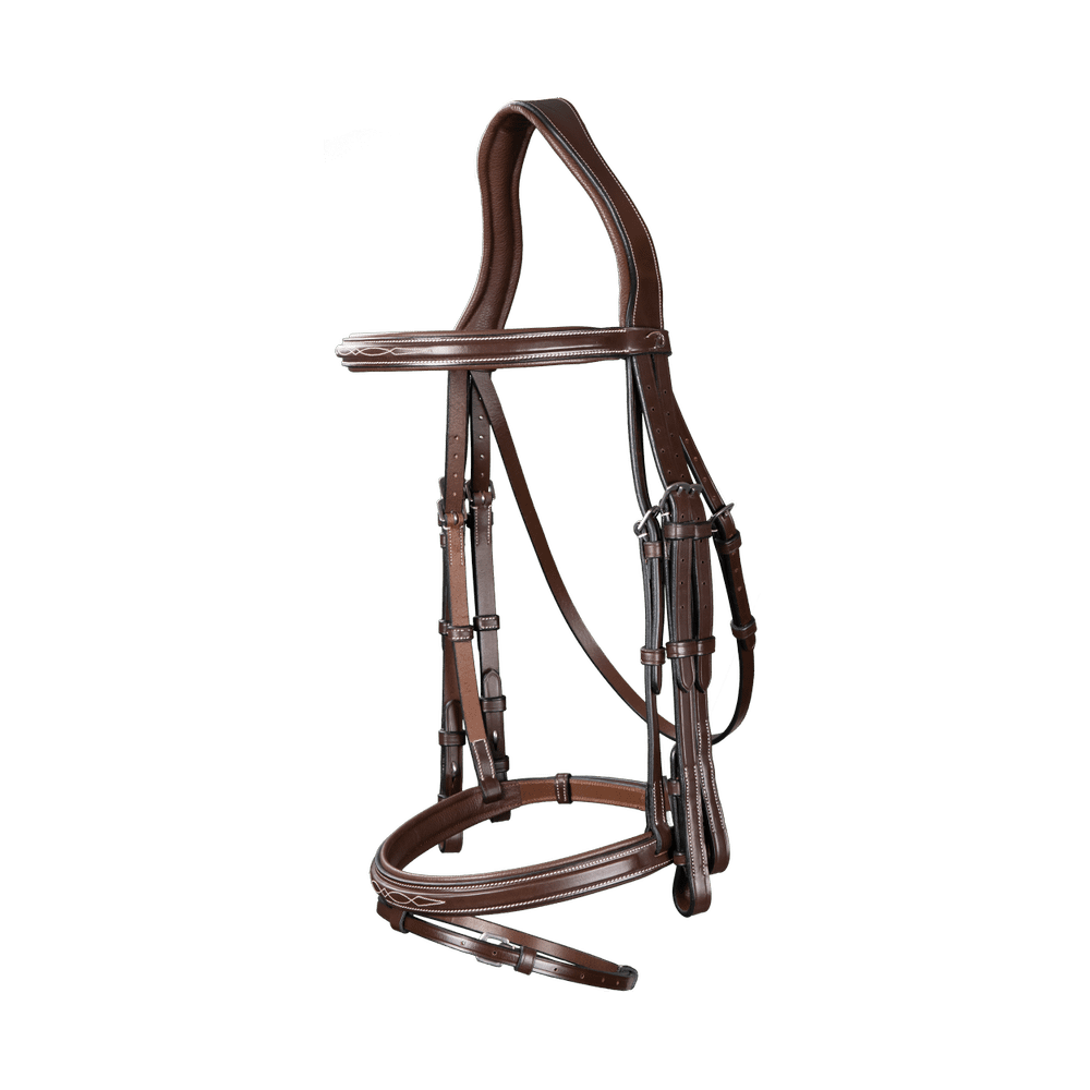 Flash Noseband Double Bridle for jumping Slightly square-raised noseband and browband with decorative topstitching 3/8” (10 mm) removable flash strap