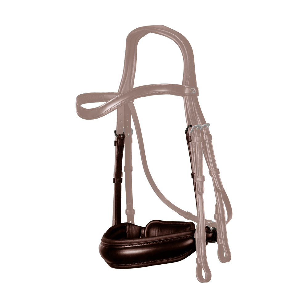 Matte Large Crank Noseband Supple anatomical 38 mm wide noseband with pull-back closure mounted on a padded protective pad. This noseband available in matte leather, patent leather, or patent leather with white lining