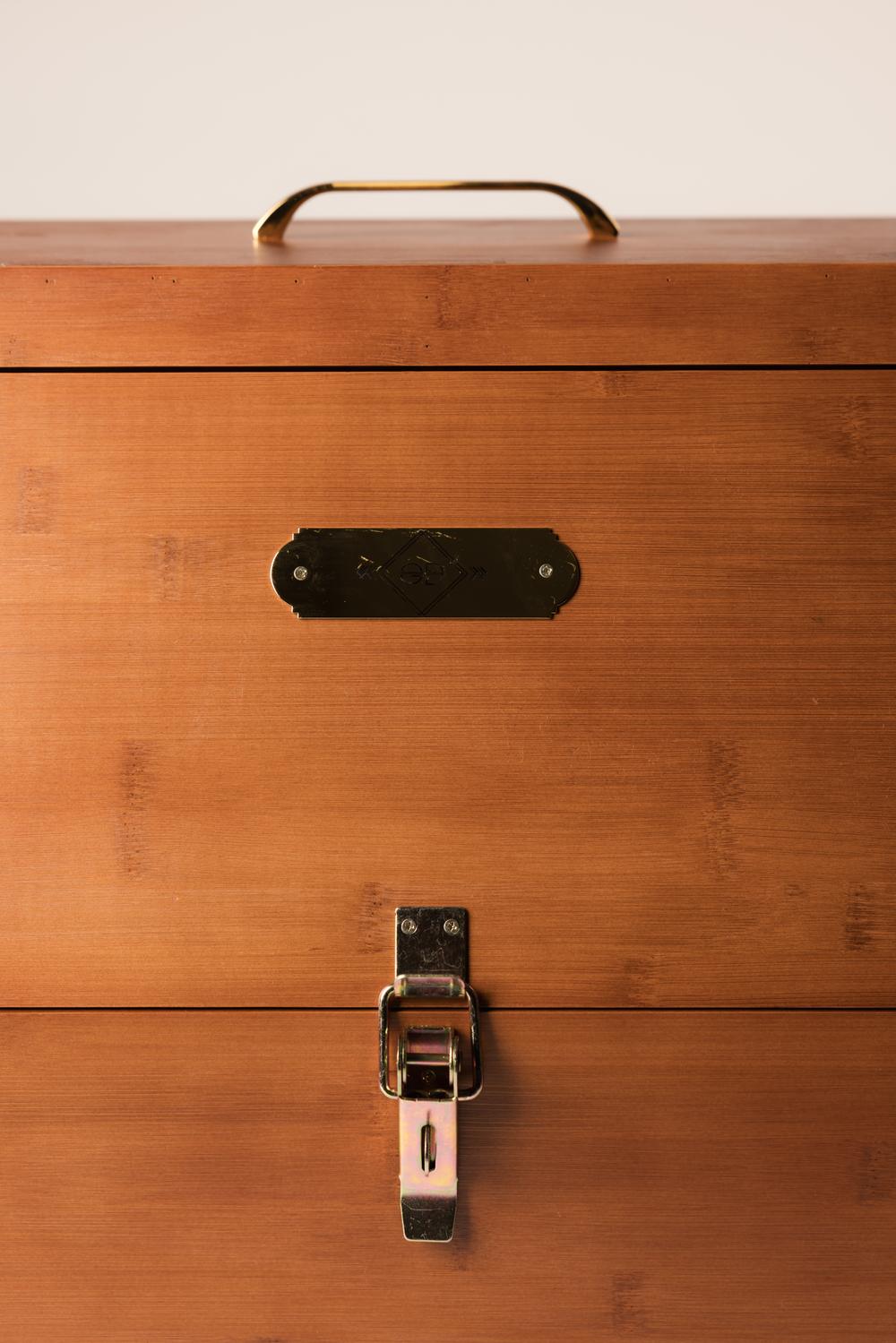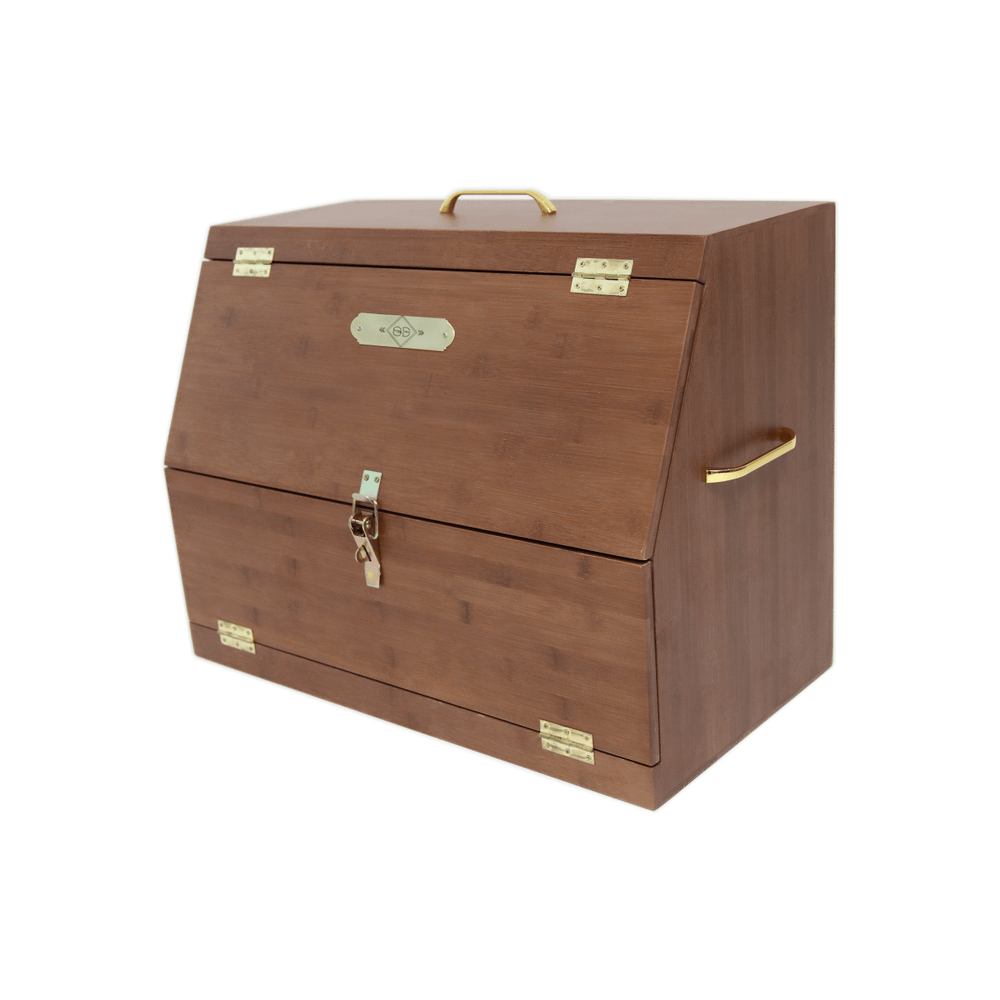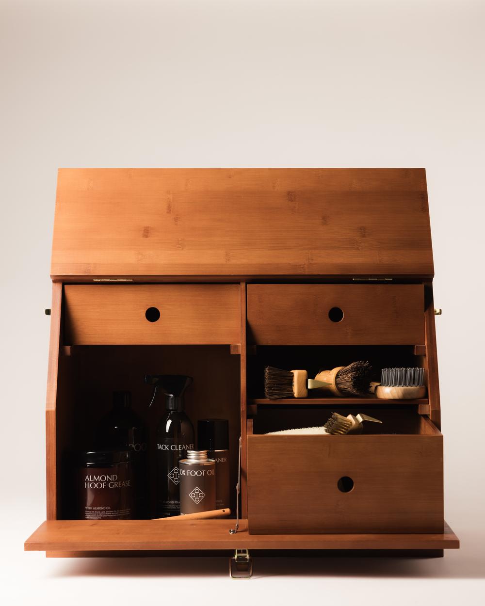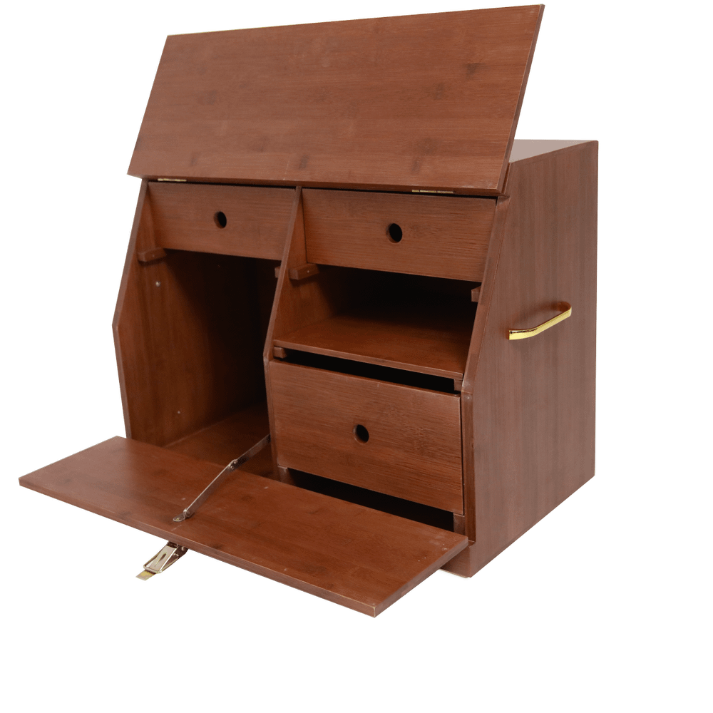 This Show Grooming Box will become your best ally to store all your grooming equipment at shows or at home. It is 43.5cm high, 59.5cm wide and 32cm deep. The box opens with two doors, closed together with a gold snap closure on which you can add a lock. Inside, you will find 2 small drawers (9.5x27.5x20 cm), one bigger drawer (14x27.5x28.5 cm), one big compartment (28.5x28x29 cm) and one smaller (8x28x28 cm). All the drawers and the bottom of the small compartment can be removed. It is ideal if you need more space, if you want to access your products or if you want to clean the box. It is made out of bamboo which makes it extra resistant and easy to clean. It comes with 3 gold handles to carry it easily. Combine style and organization for all your products with this fancy box!