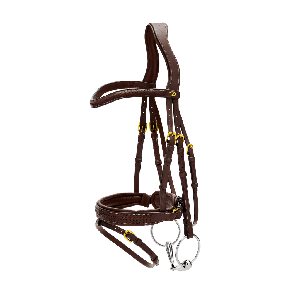 The bridle is part of the Dy’on collection which means it has cream stitching and brass buckles. There are plaited leather details on noseband and browband. Available in brown and black.