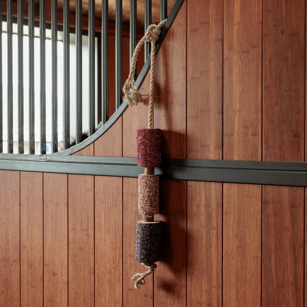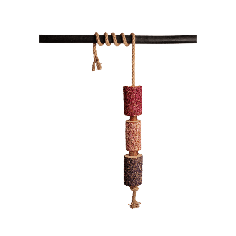 Each piece of wood is hand-selected from the forest, left in its natural state—undried, and untreated—to preserve the authentic smells and textures that horses instinctively respond to. The Unicorn Joy version is enriched with a joyful blend of herbs, each adding its own natural benefits: