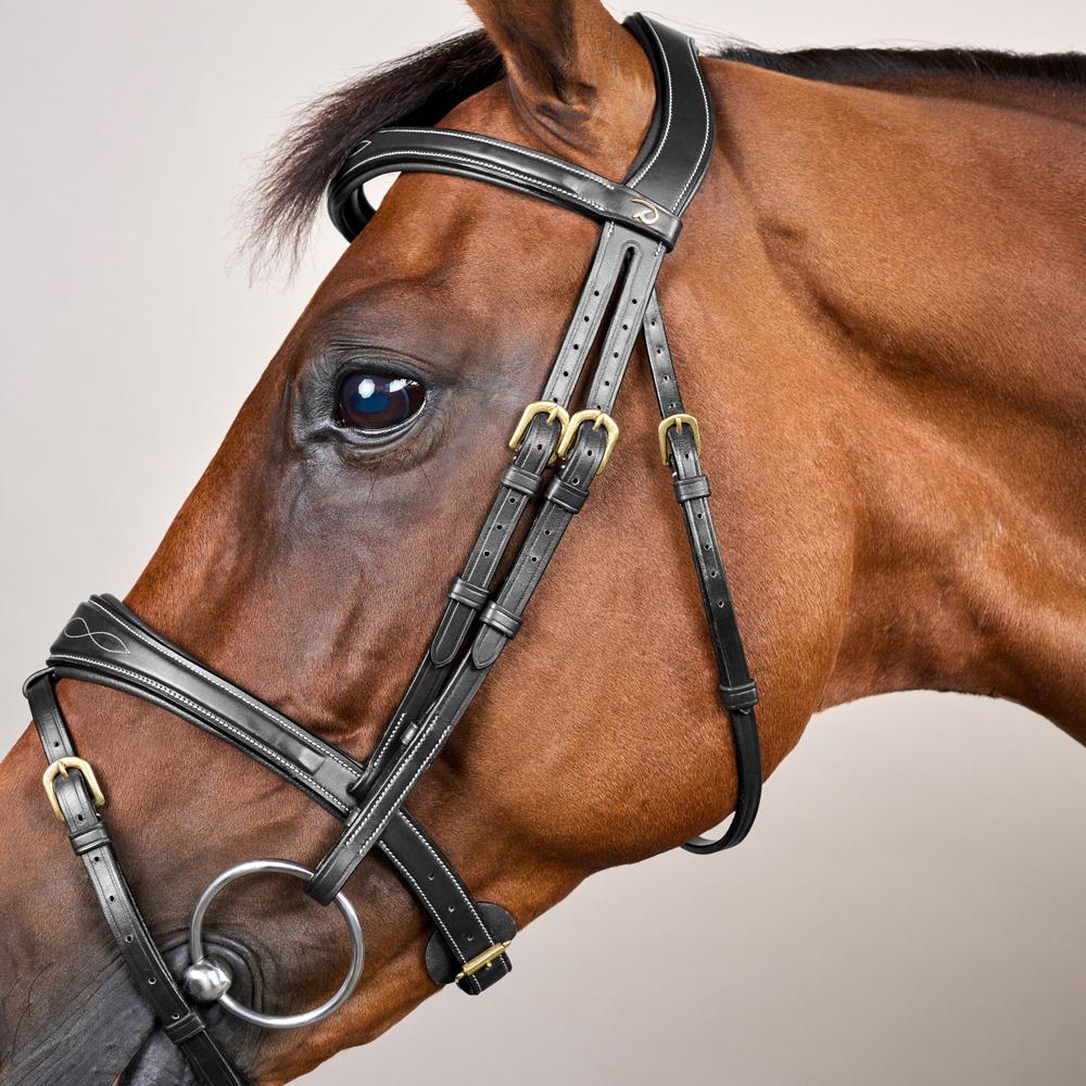 The bridle is part of the D collection, which means the color of the stitching is cream and the buckles are brass. Available in brown and black.