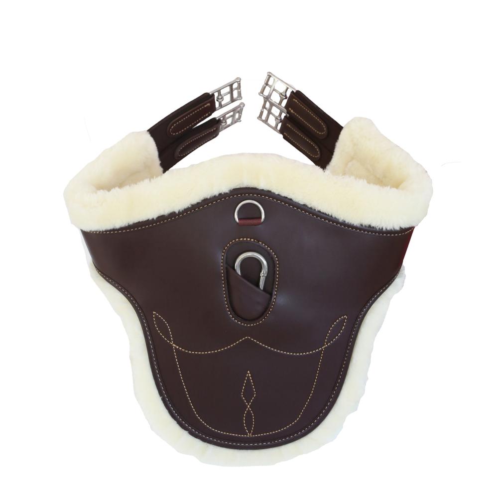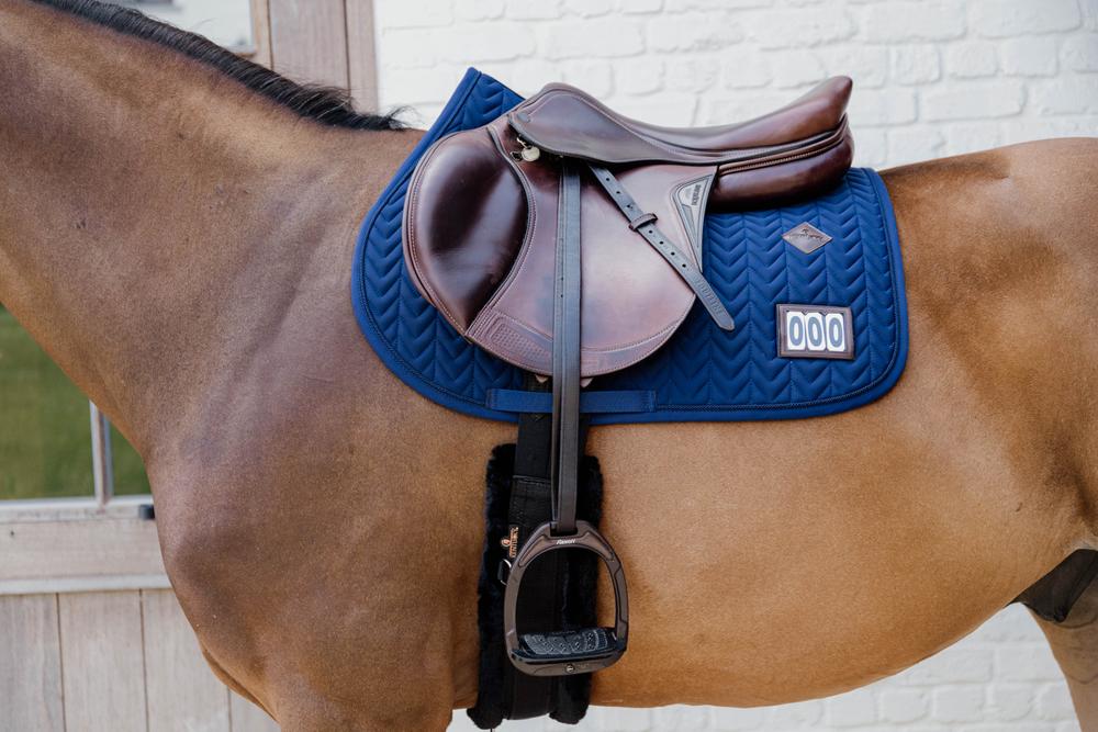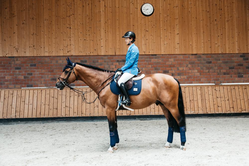 The Fishbone Competition Saddle Pad in navy with built-in number pockets ensures a professional appearance. The Wellington Fly Veil and Polar Fleece Bandages in matching dark blue create a harmonious look. The Sheepskin Stud Girth in brown adds a classy contrast and maximum comfort for jumping.