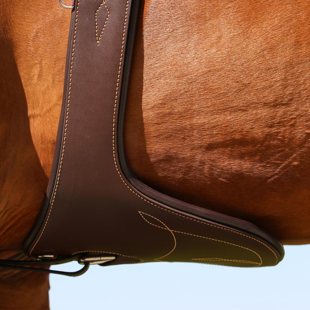 En plus du large plateau de protection, la sangle bavette est anatomiquement conçue pour offrir confort et sécurité lors des sauts tout en limitant le risque de blessures causées par les fers ou crampons. Elle libère les épaules et les coudes du cheval, lui permettant de mieux respirer et est conçue pour suivre le mouvement naturel du cheval. La sangle bavette dispose d’une mousse de protection EVA, d’élastiques triplement renforcés à chaque extrémité pour égaliser la pression, ainsi que trois anneaux en D pour fixer les enrênements et une martingale. La sangle est faite en similicuir qui n’absorbe pas les saletés ou la transpiration et est donc plus durable. Elle ne change pas de couleur et ne s’abime pas facilement. Utilisez notre spray nettoyant pour lui donner la touche brillante !