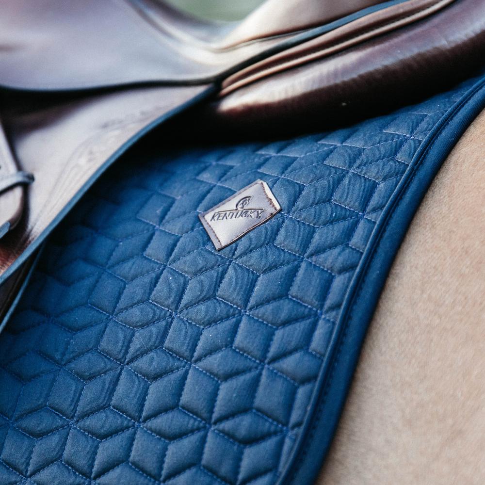 L'extérieur du tapis de selle est fabriqué à partir d'un polyester ressemblant à du coton et a un design chic de matelassage en forme carré. Sur le côté gauche du tapis de selle se trouve un petit patch en cuir vegan avec le logo Kentucky. Sous le logo, il y a suffisamment d'espace pour une broderie. La doublure du tapis de selle est un mélange coton-polyester qui évacue l'humidité.