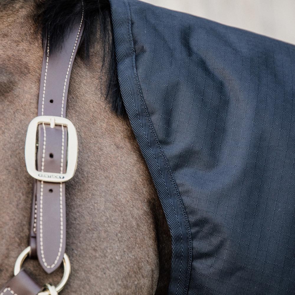 Le couvre cou d’extérieur peut être utilisé en combinaison avec nos couvertures d’extérieur. Il est disponible en deux grammages différents - 0 et 150 grammes – pour que vous puissiez l’adapter aux besoins de votre cheval. La partie extérieure est faite d’un tissu « ripstop » 600D, ce qui rend ce couvre cou résistant à beaucoup de conditions climatiques. Il est entouré de nylon, avec un intérieur en PES 210T, qui offre la même sensation au toucher qu’un sac de couchage. Le cou est fixé à la couverture avec quatre fermetures velcro et se ferme grâce à deux autres fermetures velcro . Lavable en machine à 30 °, pas de sèche-linge.