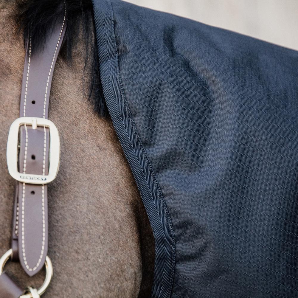 Le couvre cou d’extérieur peut être utilisé en combinaison avec nos couvertures d’extérieur. Il est disponible en deux grammages différents - 0 et 150 grammes – pour que vous puissiez l’adapter aux besoins de votre cheval. La partie extérieure est faite d’un tissu « ripstop » 600D, ce qui rend ce couvre cou résistant à beaucoup de conditions climatiques. Il est entouré de nylon, avec un intérieur en PES 210T, qui offre la même sensation au toucher qu’un sac de couchage. Le cou est fixé à la couverture avec quatre fermetures velcro et se ferme grâce à deux autres fermetures velcro . Lavable en machine à 30 °, pas de sèche-linge.