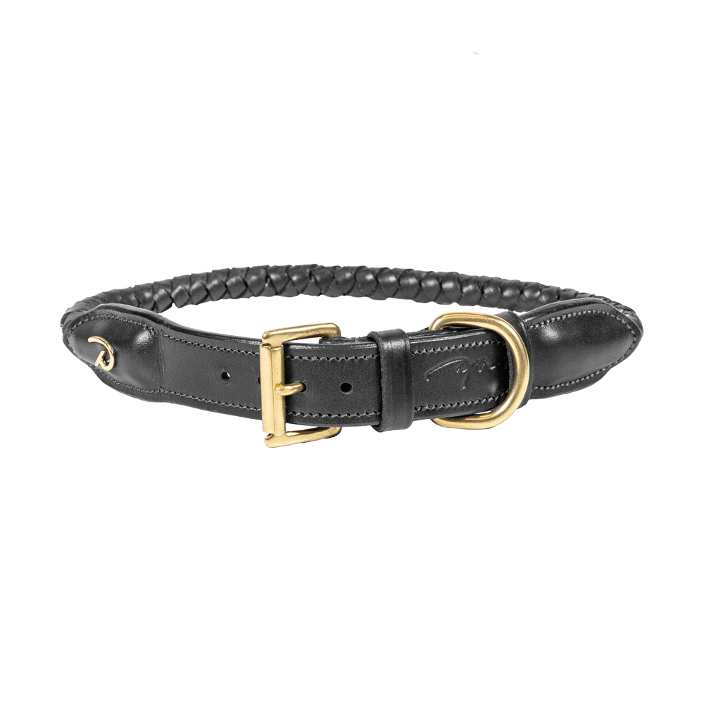 Ce collier pour chien présente des piqûres assorties, des boucles en laiton et des détails en cuir rond tressé. Le collier est disponible en marron et en noir.