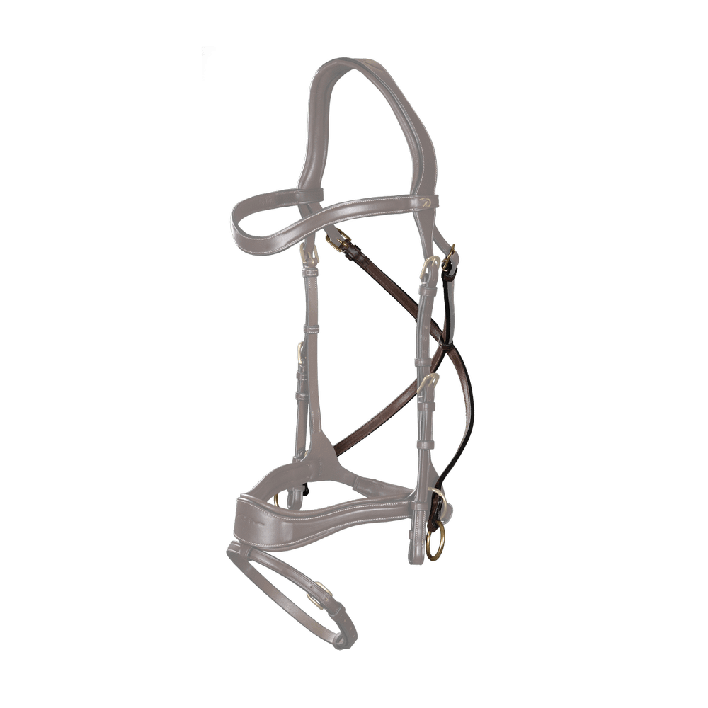 Cross pull straps are for the D Motion bridle. They pass through the D buckles of the noseband, cross under the throat and attach to the throatlatch of the D Motion headpiece to ride in Cross Pull mode. Once in place, the reins can be attached to the rings of the cross pull straps.