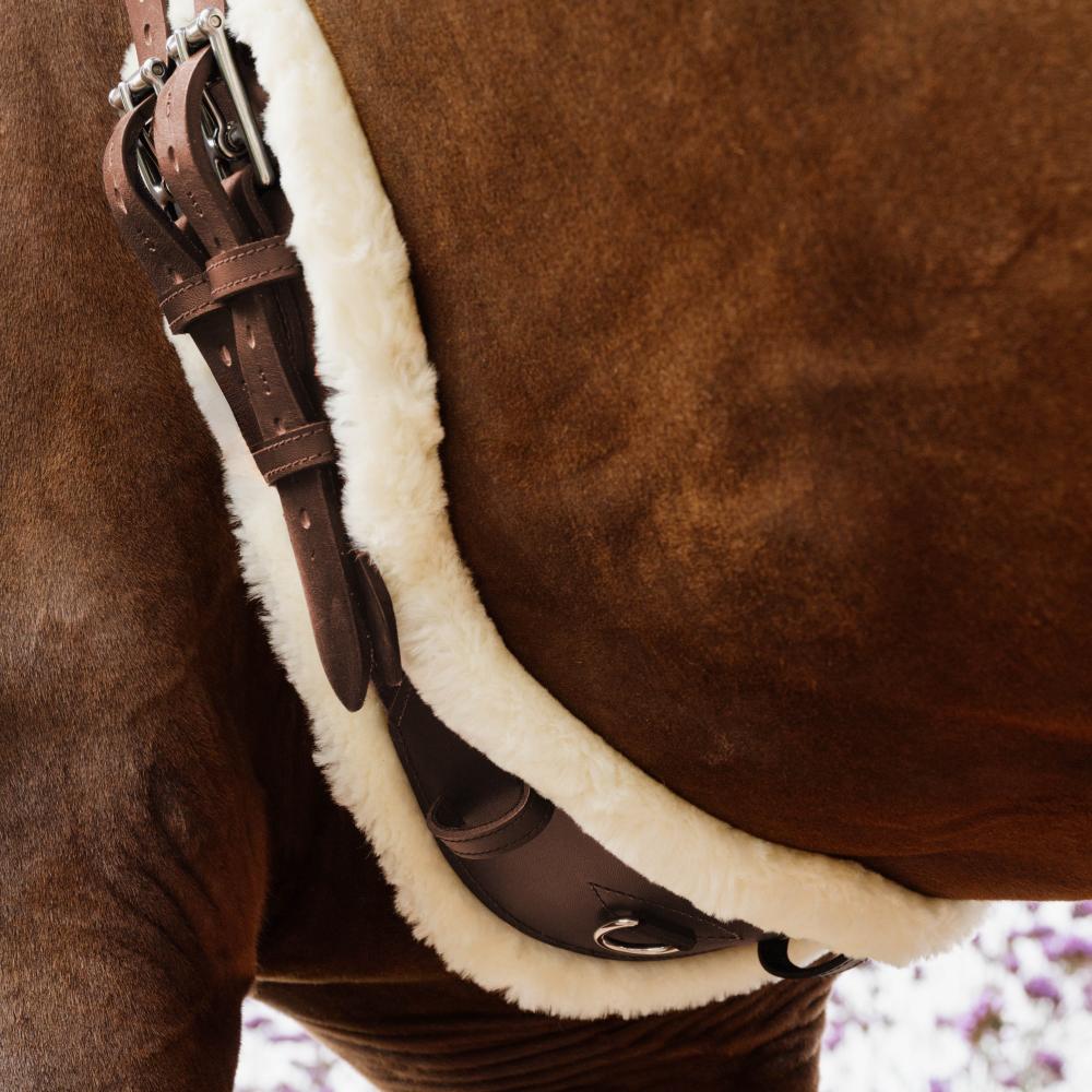 Fabriquée à partir de cuir artificiel de haute qualité, cette sangle offre l’élégance du cuir véritable tout en étant résistante à la saleté, à la sueur et à l’eau. Le matériau est facile à entretenir, garantissant un excellent état pendant des années. Une couche douce en peau de mouton artificielle ajoute un confort et une protection supplémentaires, idéale pour les chevaux à la peau sensible, et peut être facilement retirée pour le lavage grâce à son attache en Velcro. Le renforcement en nylon assure une solidité accrue, empêchant l’étirement et assurant des performances constantes. Disponible en marron et noir.