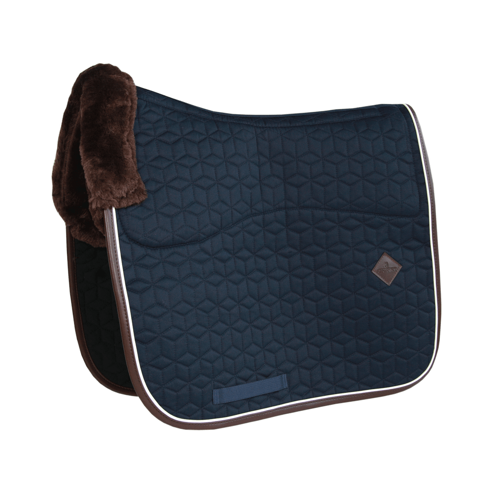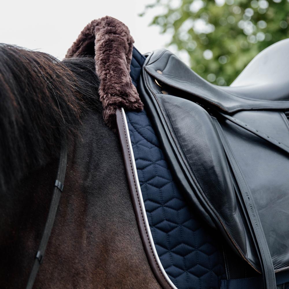 La peau de mouton artificielle à l'intérieur du tapis Skin Friendly Dressage et sur le garrot, offre énormément de confort au cheval.