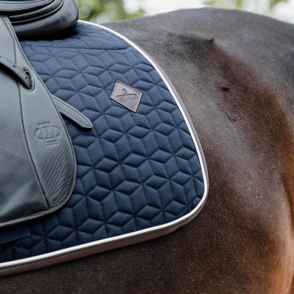 Le tapis n'a pas de sangles à attacher à la selle, seulement une courroie en nylon au passage de sangle. Le tapis de selle comporte un logo en cuir subtil, tout en offrant suffisamment d'espace pour broder le tapis de selle si nécessaire.