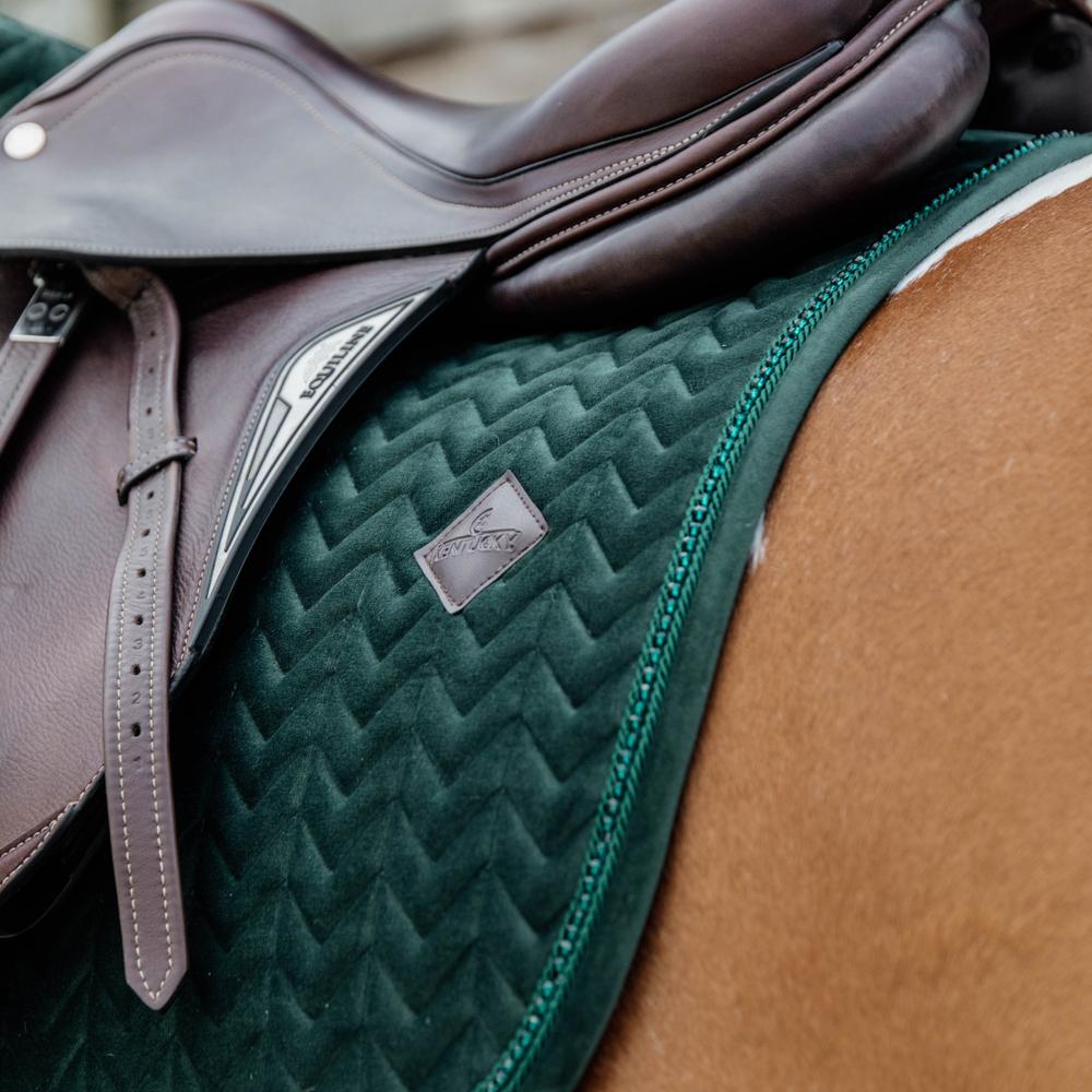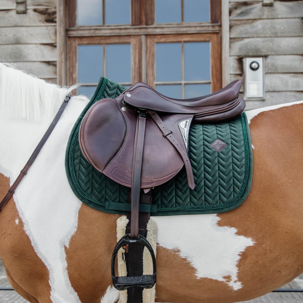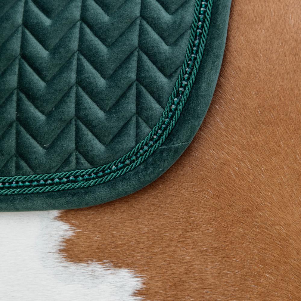 L'extérieur du tapis de selle est fabriqué à partir de notre célèbre et doux tissu velvet surpiqué en « Fishbone ». Le passepoil est terminé par des perles très chics. La doublure du tapis de selle est un mélange de coton et de polyester qui absorbe facilement la sueur et est très respirant.