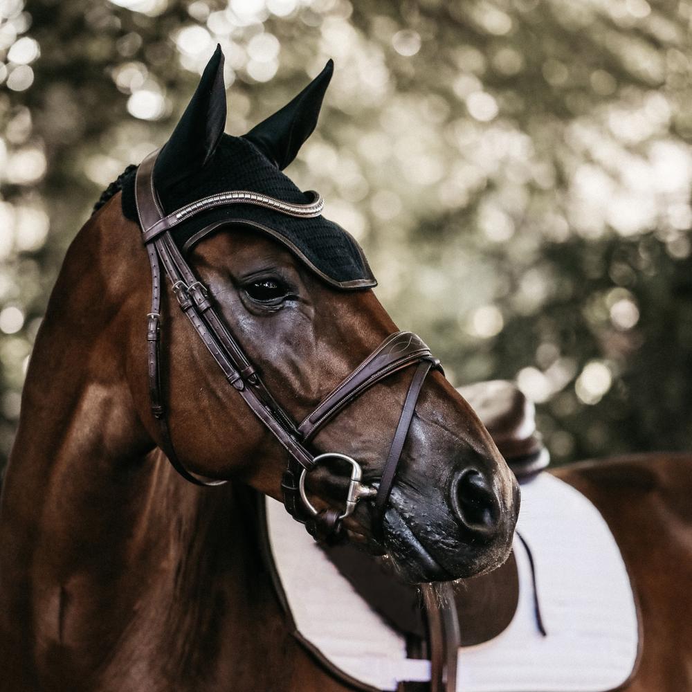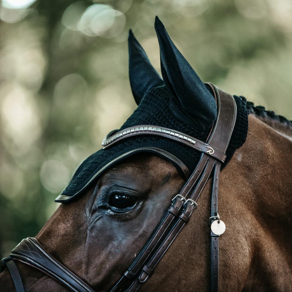 Notre Fly Veil Leather combine le look américain moderne et l’expertise de Kentucky Horsewear. Il protège les oreilles du cheval contre les mouches pendant le travail. Ce bonnet n’a pas de logo visible, le cavalier ou les sponsors peuvent donc broder leur propre logo.