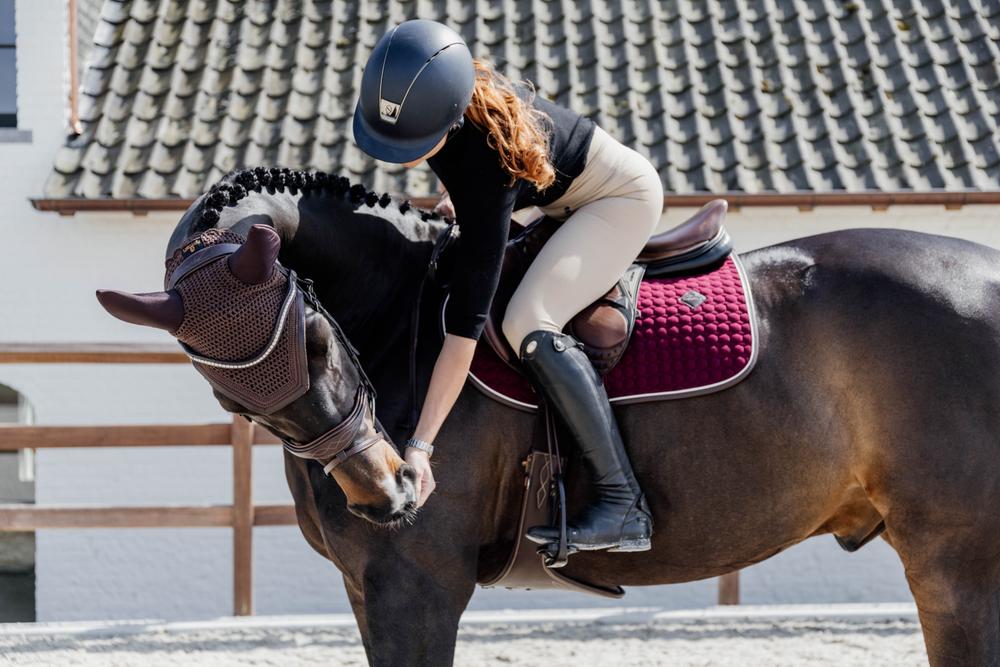 Ce bonnet est crocheté à la main pour une meilleure durabilité. Il possède un bordereau en cuir brun vegan. Ce bonnet n’a pas de logo visible, le cavalier ou les sponsors peuvent donc broder leur propre logo.