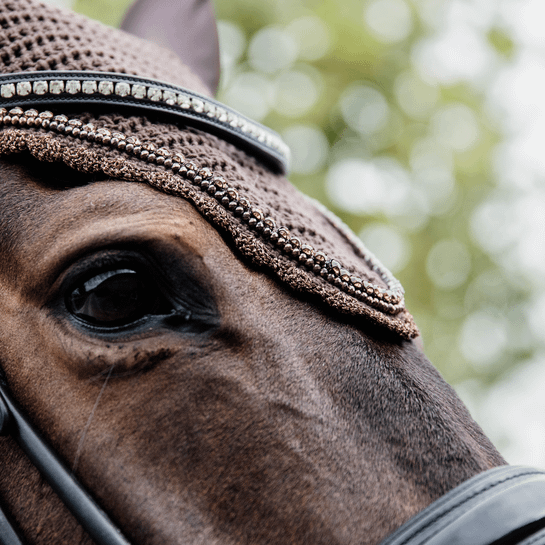 Notre Fly Veil Long Stone & Pearl offre toute l’expertise de Kentucky Horsewear. Il protège les oreilles du cheval contre les mouches pendant le travail. Il fait tourner toutes les têtes! Ce bonnet n’a pas de logo visible, le cavalier ou les sponsors peuvent donc broder leur propre logo.