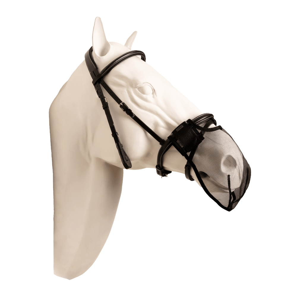 Le Filet De Nez Anti-mouches est idéal pour les chevaux extrêmement sensible aux insectes. Il peut être utilisé quotidiennement lors de vos séances mais également en concours. Le filet de nez anti-mouches ne gêne ni le mors ni la respiration du cheval. Le Filet De Nez Anti-mouches peut aussi être utilisé au pré ou dans les écuries, combiné avec un licol.