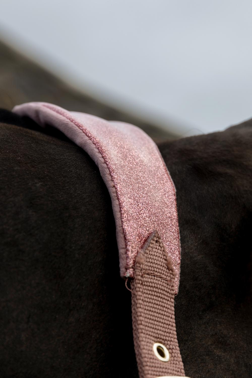 Pour tous les fans de notre équipement en velours, nous avons désormais un licol avec paillettes ! La plaque nominative est réversible et peut être gravée avec le nom de votre cheval, par exemple.