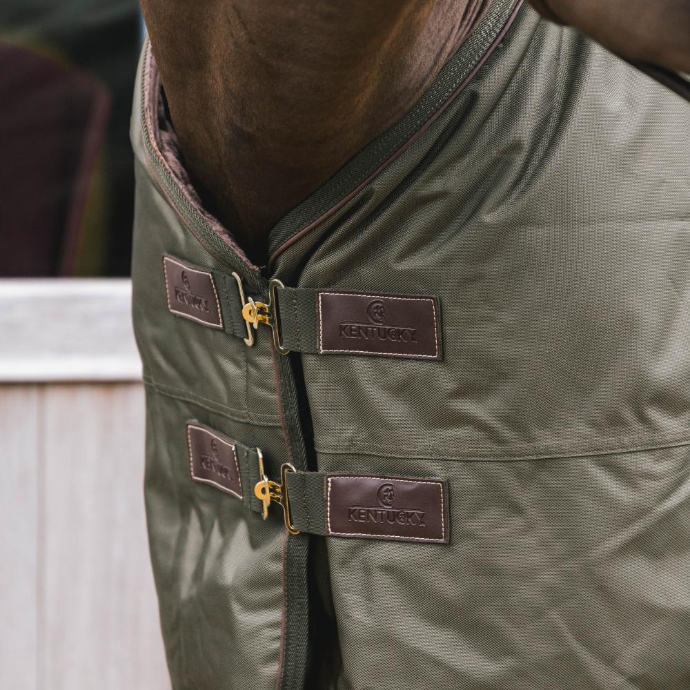 La couverture est de forme anatomique et ne comporte aucune couture sur le dos pour éviter les fuites. Grâce à la peau de lapin artificielle, la couverture se remet toujours à la bonne place après que le cheval se soit roulé. La couverture est équipée d'une fermeture autoaggripante avec 2 fermetures frontales, 2 sursangles croisées en tissu de ceinture de sécurité et une courroie de queue recouverte de plastique (pour un nettoyage facile). Pour plus de protection, il est possible d'acheter un couvre-cou séparé.