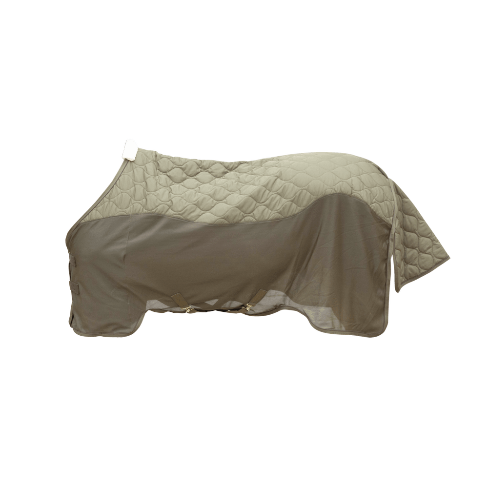 Le dos de cette couverture est fabriqué dans un tissu solide et résistant aux déchirures. Il est composé à 100 % de polyester enduit de PU. Grâce à son rembourrage de 150 g et à sa doublure intérieure en polaire absorbant la transpiration, votre cheval restera au sec sans avoir froid. Les parties en filet sur les côtés permettent à la couverture de bien respirer. De la peau de mouton végétalienne a été ajoutée au niveau du garrot pour un confort encore plus grand.
