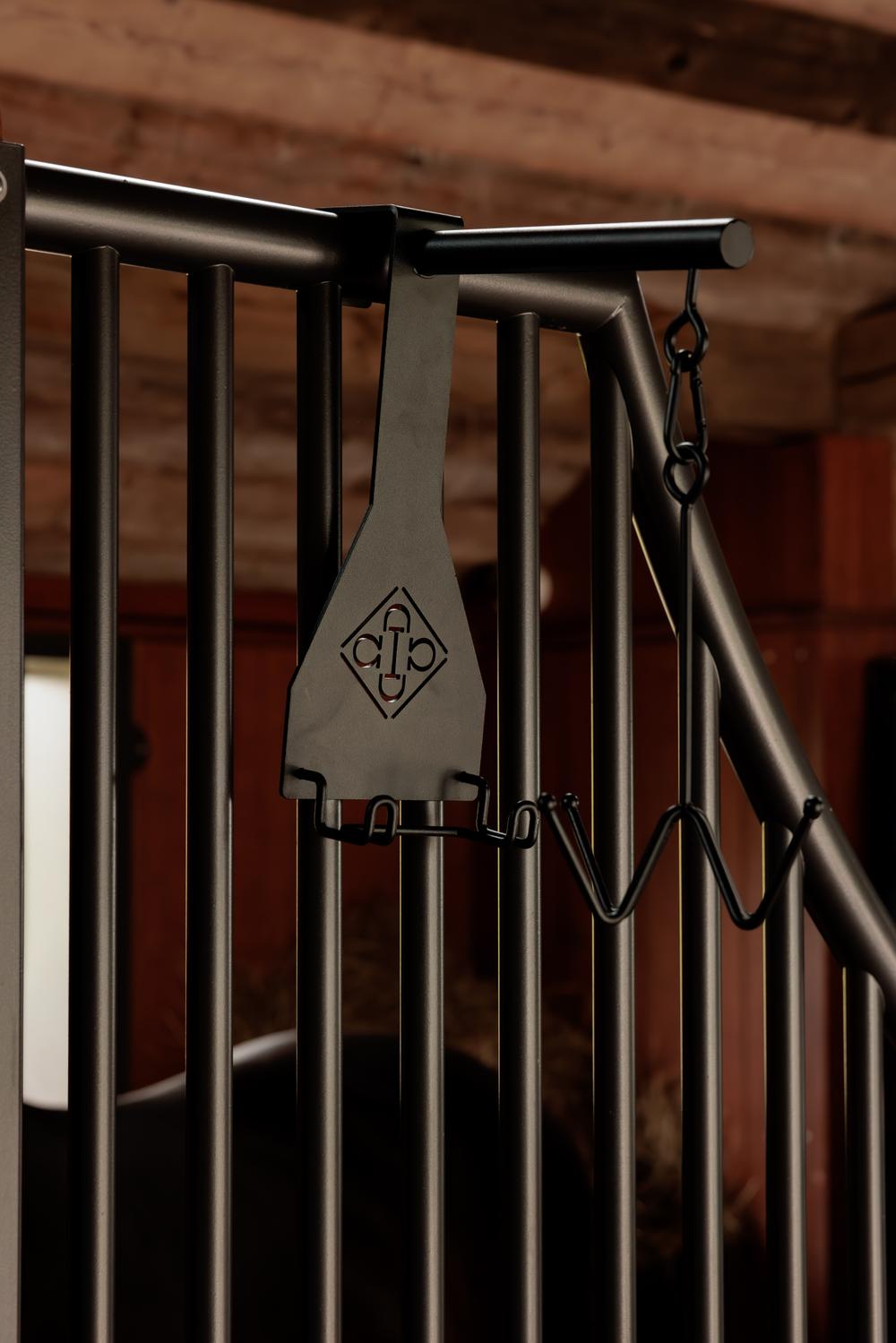 Le crochet porte-bridon à 4 branches est une solution élégante et robuste pour organiser vos brides et autres accessoires équestres. Fabriqué en acier durable et doté d'une finition de haute qualité en poudre thermolaquée, ce crochet garantit fiabilité et longévité. Ses 4 branches permettent de ranger proprement les brides, licols et autres équipements. Facilement fixé sur un mur d'écurie, une porte ou toute autre surface capable de supporter le crochet. Il allie praticité et design élégant. L'extrémité de la pique est dotée d'un embout pour protéger le cheval et éviter toute blessure.Disponible en argent, or ou noir, il s’intègre parfaitement à tout espace équestre.