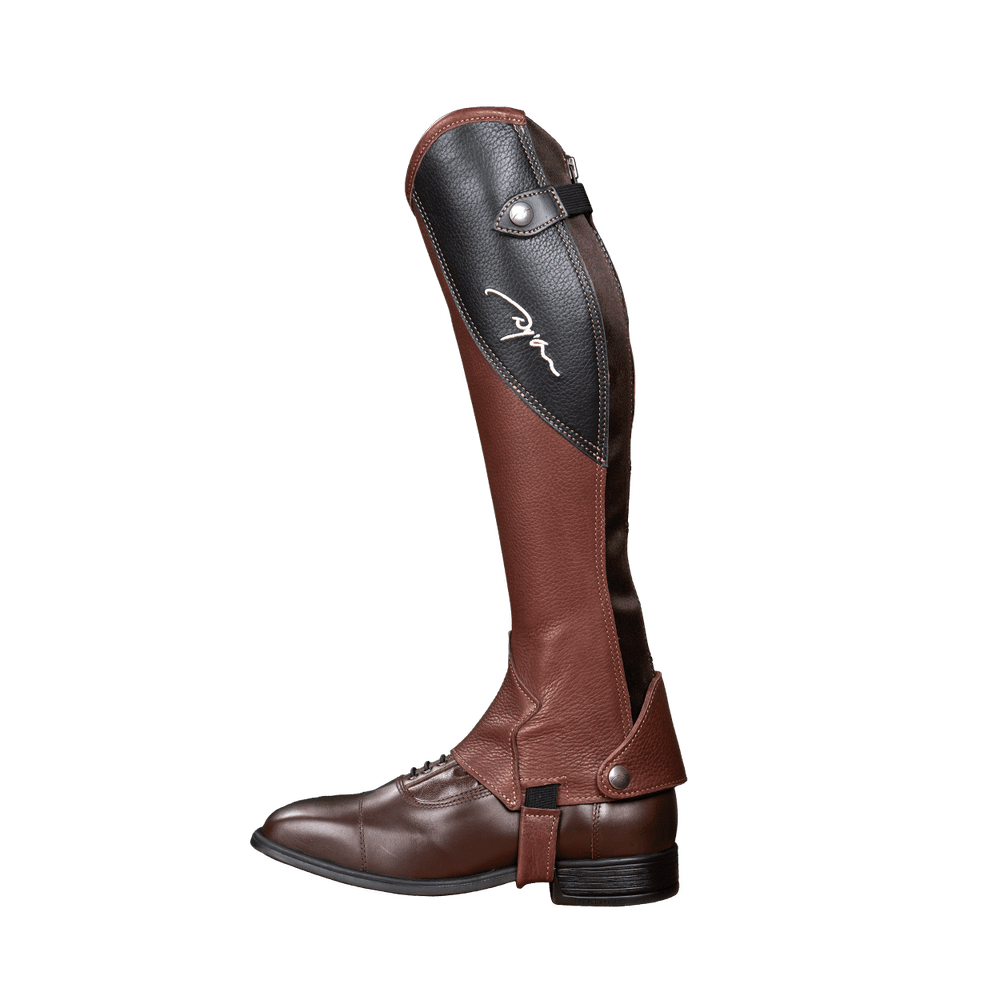 Les Original Half Chaps incarnent l’héritage de Dy’on : un mélange intemporel de durabilité, de style emblématique et d’innovation au service du cavalier. Le cuir pleine fleur de 2 mm d’épaisseur assure une excellente protection tout en restant souple et agréable à porter. Le haut en forme de goutte, subtilement brodé du logo Dy’on en fil crème, apporte une touche élégante et reconnaissable. En noir ou en brun, les deux versions arborent un haut noir raffiné pour un look cohérent et soigné.