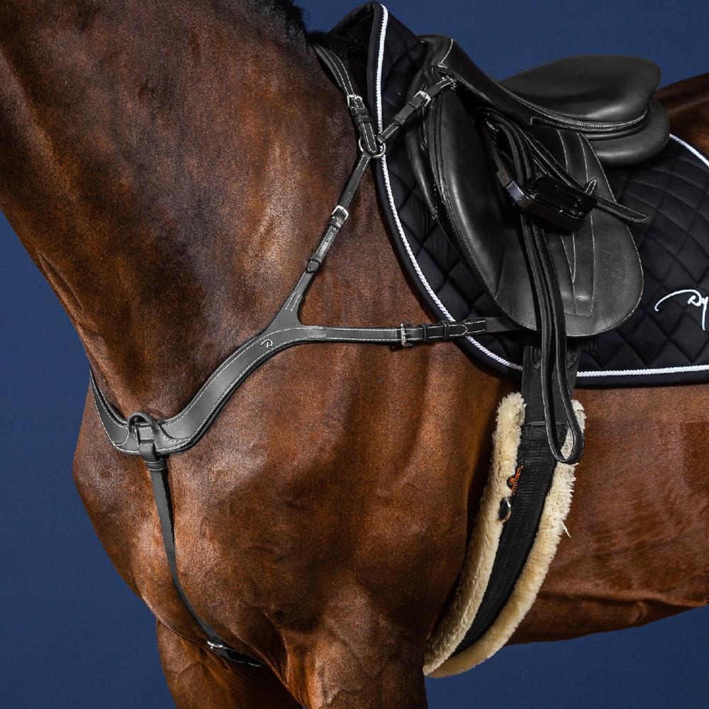 Adjustable bridge 5 points of at tachment Curved for completely unrestricted shoulder movements 6 cm long elastic bands for comfort Snap hooks for at taching to the saddle
