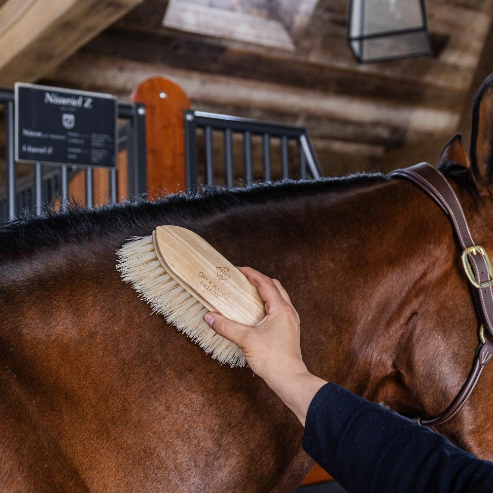 This wooden brush with long, soft bristles is designed for gentle daily grooming moments. The dark polypropylene bristles softly remove dust and loose hair, making it ideal for finishing the coat or grooming sensitive areas. The natural wooden body feels light and comfortable in the hand, supporting a calm and caring grooming ritual. Clean your brush by rinsing it in warm soapy water and let it dry naturally to ensure long-lasting use. A timeless essential for refined daily care.