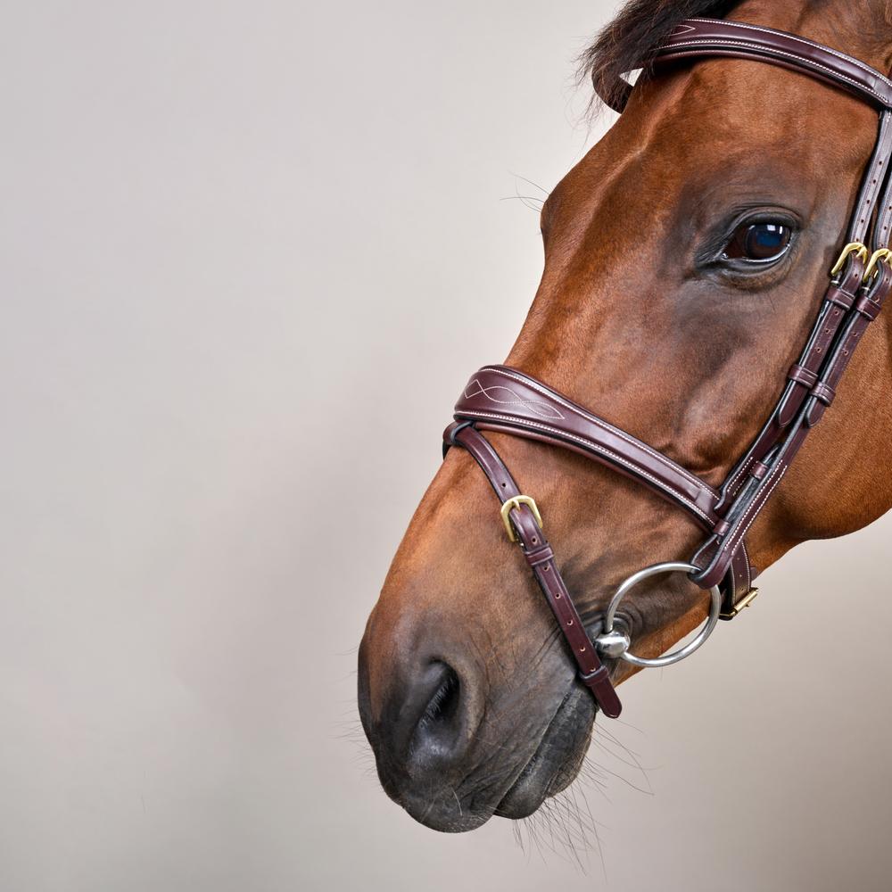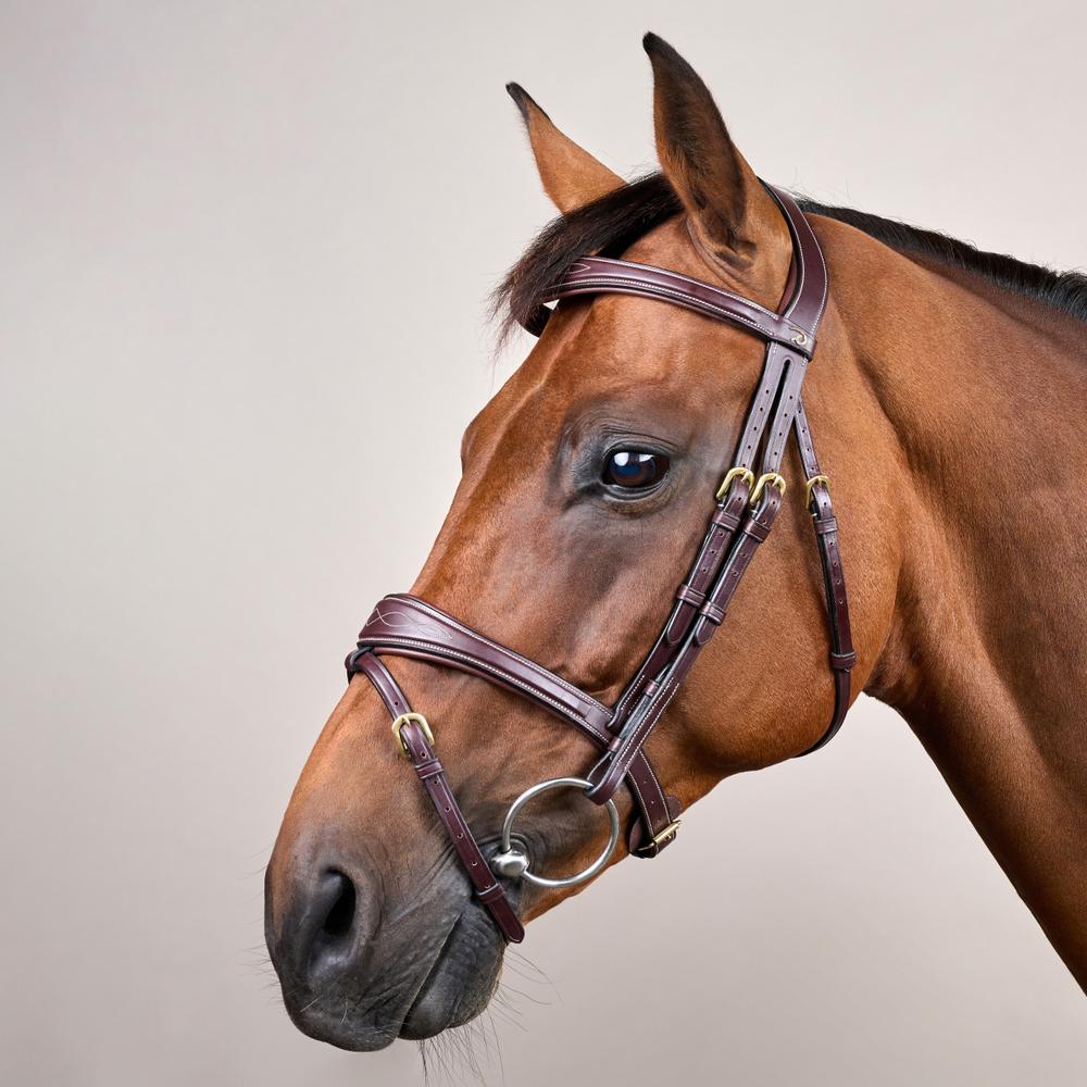 The bridle is part of the D collection, which means the color of the stitching is cream and the buckles are brass. Available in brown and black.