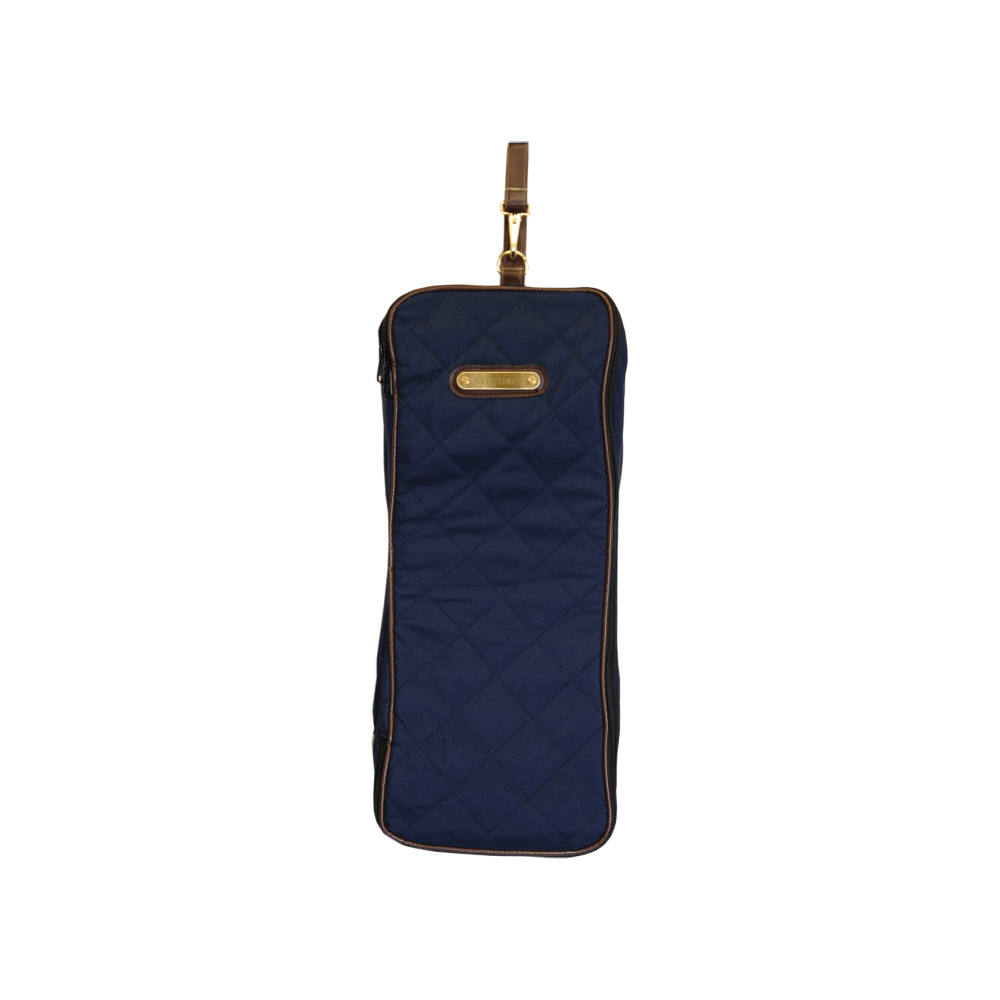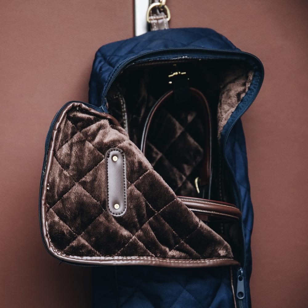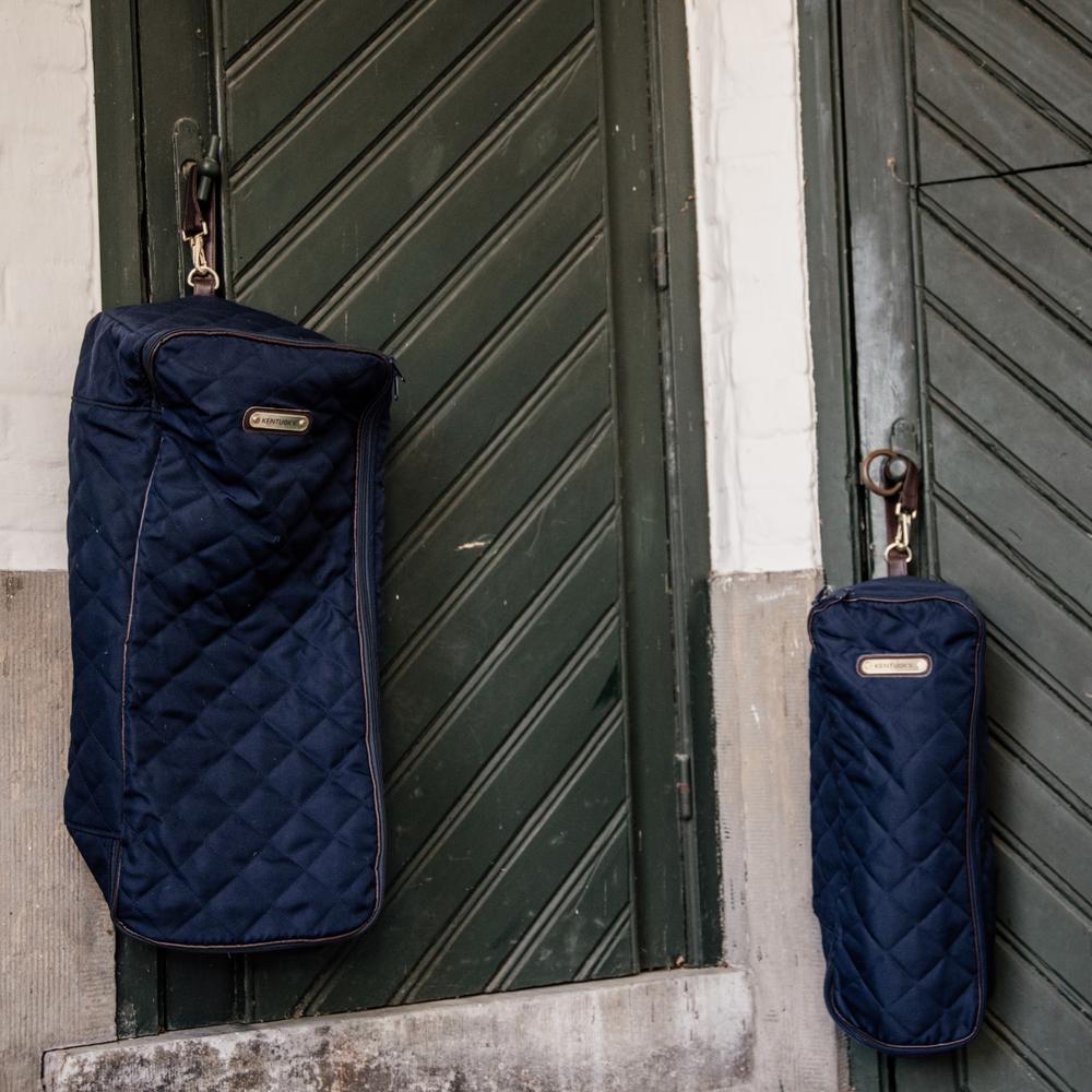 The Kentucky Horsewear Bridle Bag offers protection to your bridles during transportation, at shows or at home. The Bridle Bag has artificial rabbit skin on the inside to avoid scratches on the leather. It features a hook on the inside to easily attach your bridle. The name tag on the front can be turned over to be personalized. The Bridle Bag can be attached to anything thanks to the hook & ring on the top. It has the same diamond quilting that our stable set (curtain, guard, head protector) and our rugs! Therefore, this Bridle Bag tops of the Kentucky show look. It is machine washable at 30°, no dryer.