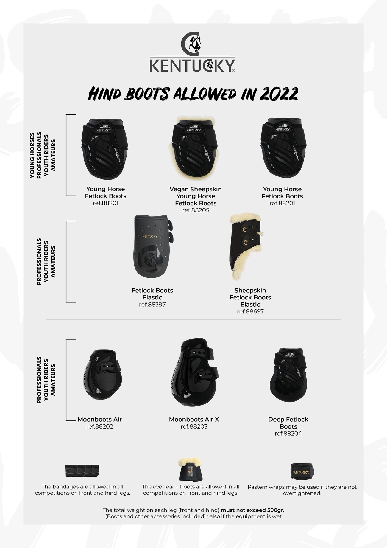 De Kentucky Young Horse Fetlock boots voldoen volledig aan de nieuwe regels. Door de anatomische vorm draaien de getten niet tijdens het rijden. Deze zijn bovendien enorm licht en uitgerust met een Proteck Impact Gel die meer dan 50% van de impact absorbeert. Deze technologie maakt de beschermers enorm uniek in zijn soort. De Young Horse Fetlock beschermers zijn verkrijgbaar in zwart en bruin, al dan niet met een schapenvacht binnenkant. Ook de Kentucky Deep Fetlock boots zijn conform aan de nieuwe FEI-regels. Het verschil met de Young Horse Boots is dat de Deep Fetlock Boots een extra flap hebben om de koot te beschermen. Deze flap is plooibaar en zacht, hierdoor wordt er met het verlengde deel geen rekening gehouden tijdens de meting. De Deep Fetlock beschermer is een echte favoriet bij ruiters zoals Constant van Paesschen.
