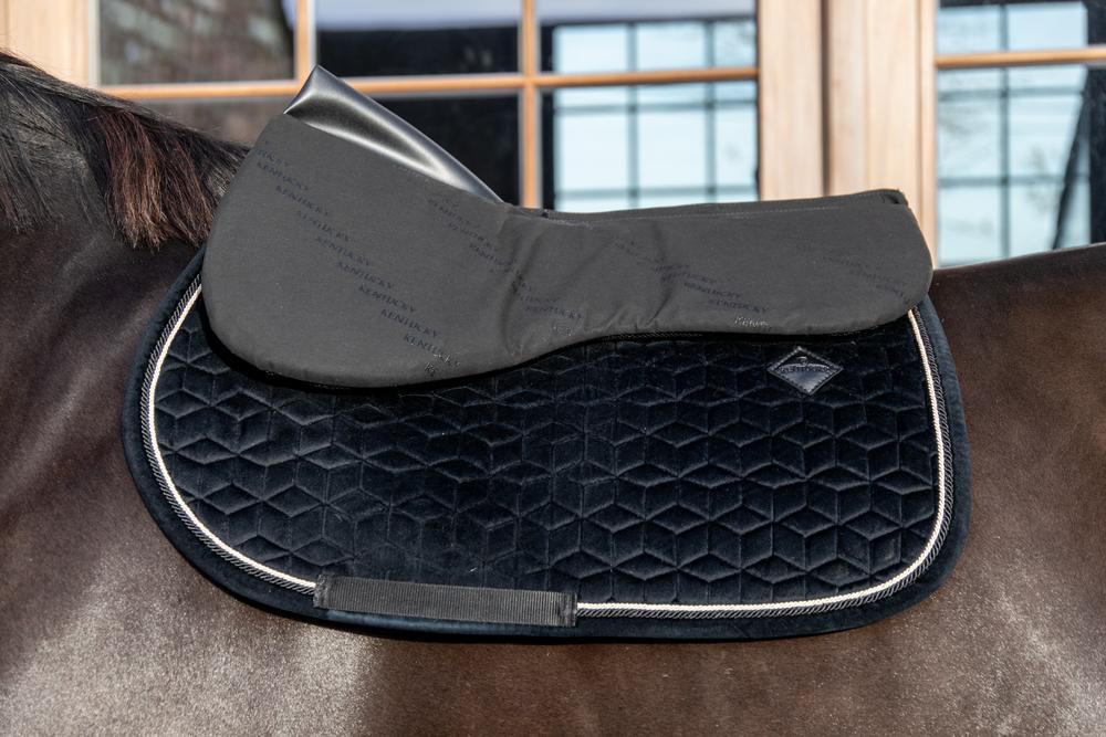 De uitsparing voor de schoft is gemaakt uit artificieel leder. Hierdoor voelt de pad comfortabel aan en zorgt het niet voor druk op de ruggenwervel. Om ervoor te zorgen dat de pad niet verschuift tijdens het rijden, is het voorzien van een silicone grip patroon.