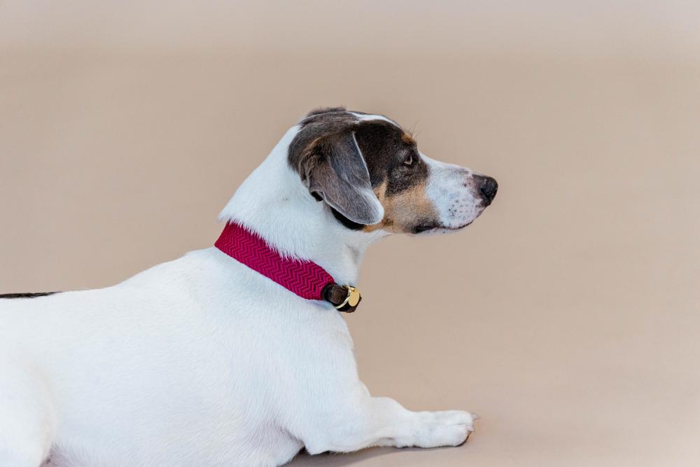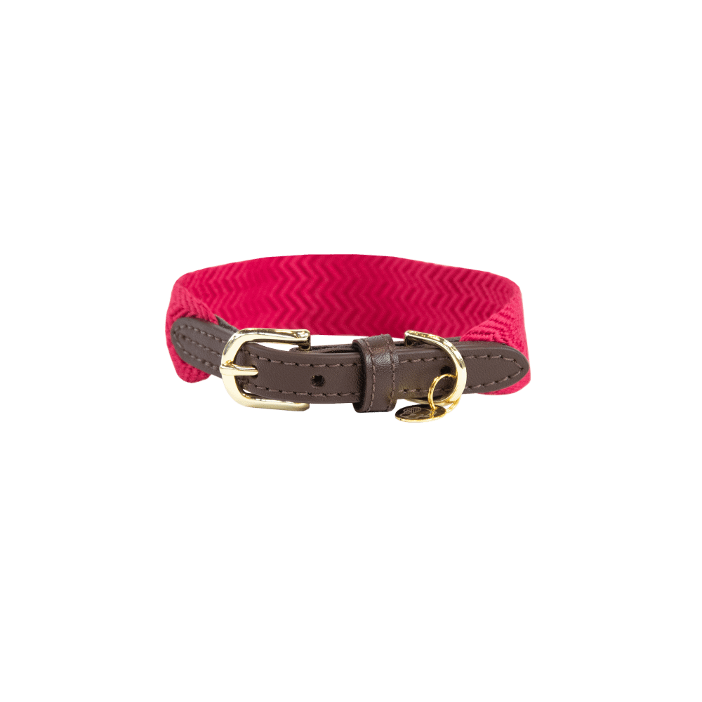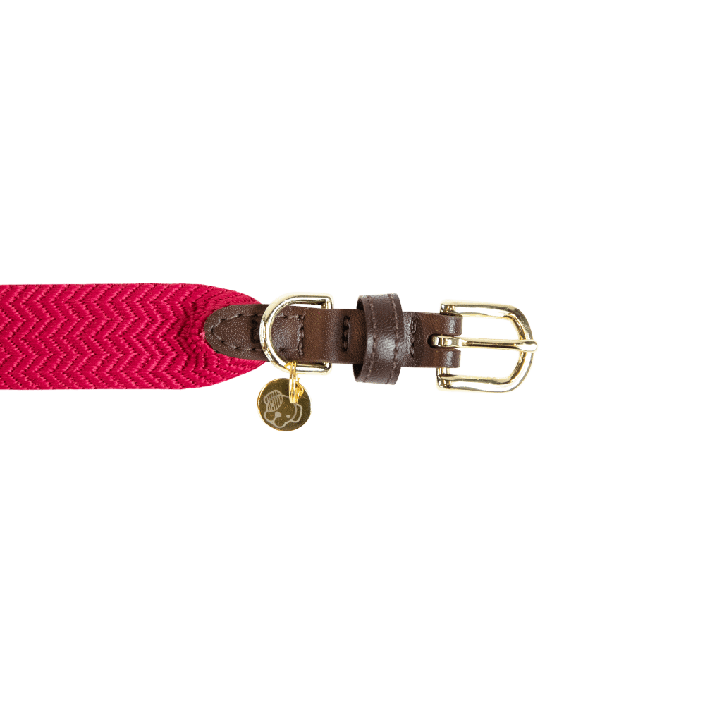Our dog collar ‘Jacquard’ is made out of sturdy, yet supple and light nylon. Therefore, it is ideal to wear during those hot summer days but can bring color to those dark winter days too. Because of its width, the collar very comfortable for your dog to wear. The gold-plated buckle on our artificial leather, gives it a very classy finish.