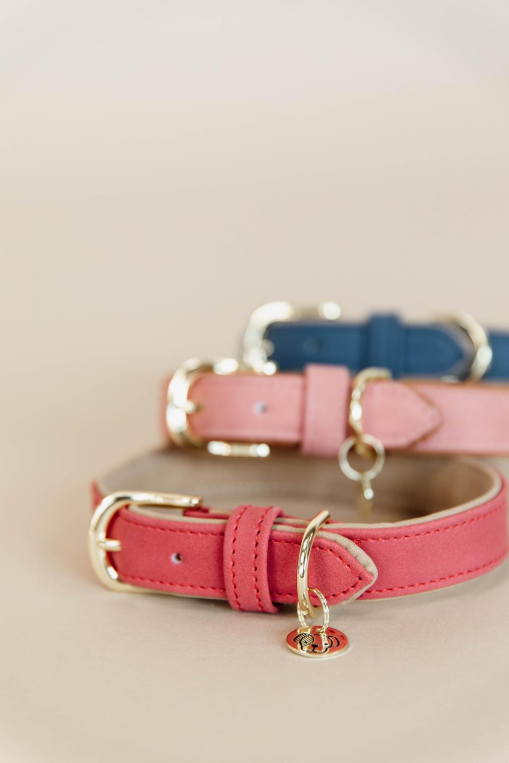 The vegan leather is extremely soft and very supple. Thanks to its softness, the material is perfect for dogs who are sensitive to chaffing. The lightweight vegan leather is very comfortable to wear. The hardware on the dog collar is a gold-plated brass.