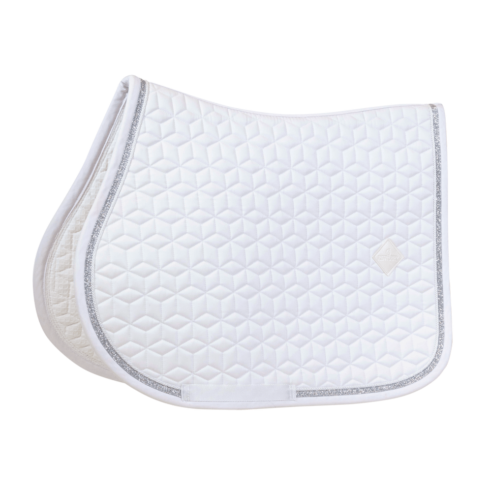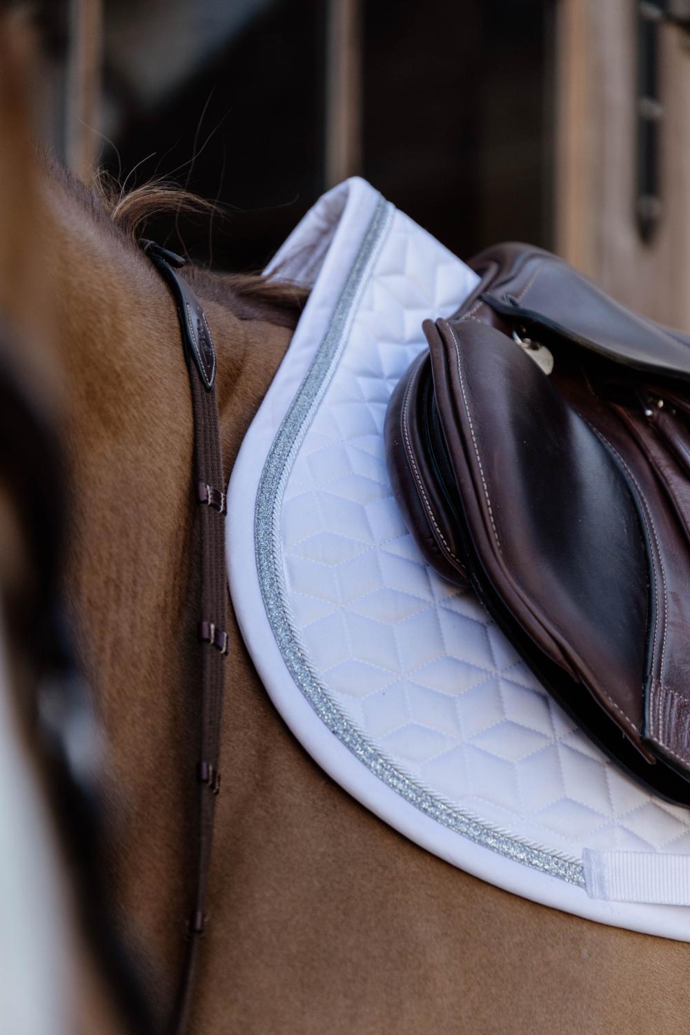 This saddle pad has a unique star quilting and features a stunning Glitter rope binding.