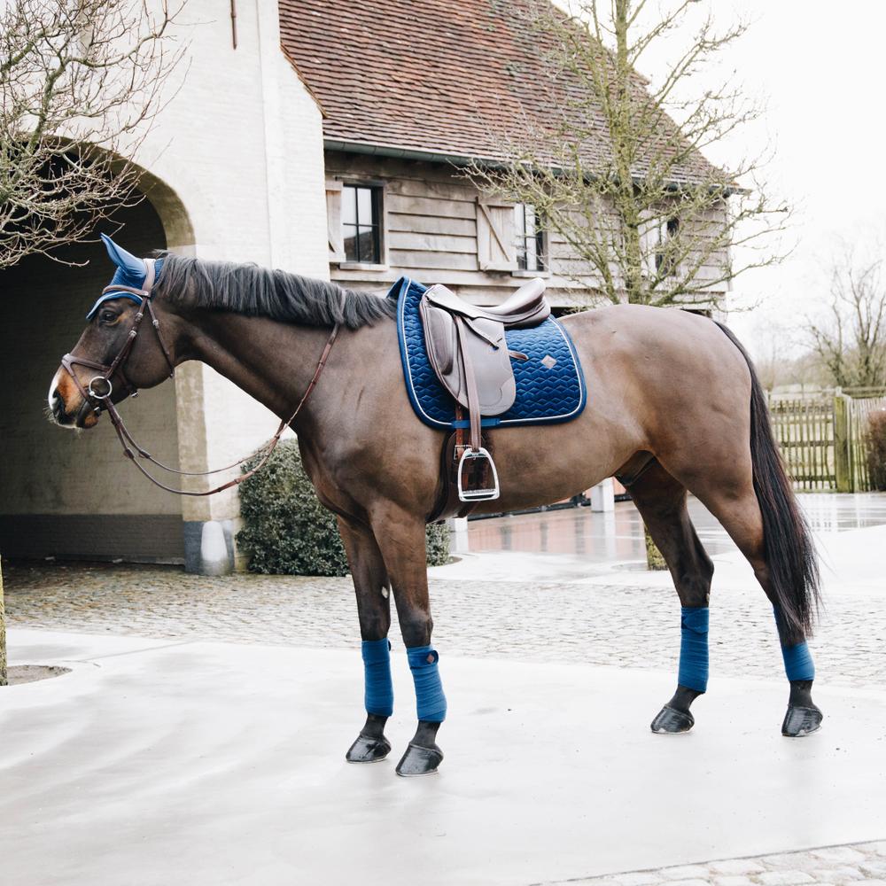 The Saddle Pad Basic Velvet Dressage is super stylish and classy, with a double twisted piping. The subtle artificial leather logo is placed in a central, slightly higher place which always leaves room for embroidery of your own logo if desired.