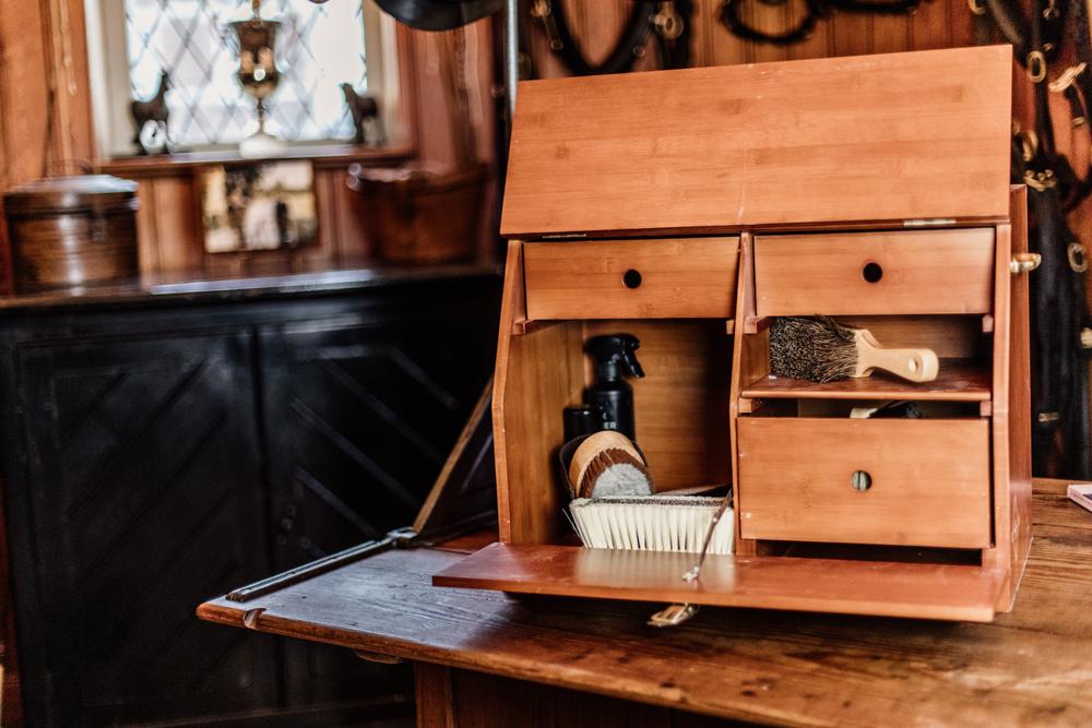 This Show Grooming Box will become your best ally to store all your grooming equipment at shows or at home. It is 43.5cm high, 59.5cm wide and 32cm deep. The box opens with two doors, closed together with a gold snap closure on which you can add a lock. Inside, you will find 2 small drawers (9.5x27.5x20 cm), one bigger drawer (14x27.5x28.5 cm), one big compartment (28.5x28x29 cm) and one smaller (8x28x28 cm). All the drawers and the bottom of the small compartment can be removed. It is ideal if you need more space, if you want to access your products or if you want to clean the box. It is made out of bamboo which makes it extra resistant and easy to clean. It comes with 3 gold handles to carry it easily. Combine style and organization for all your products with this fancy box!