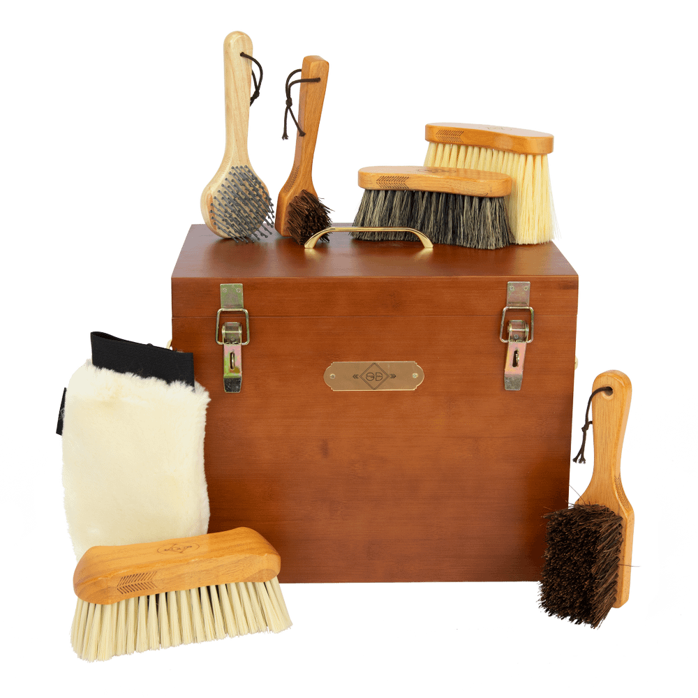 This Tack Box Set contains: Middle Brush Long, Body Brush Middle Soft, Middle Hard Brush, Sheepskin Grooming Glove, Mane Brush, Hoof Brush, Hoof Pick.