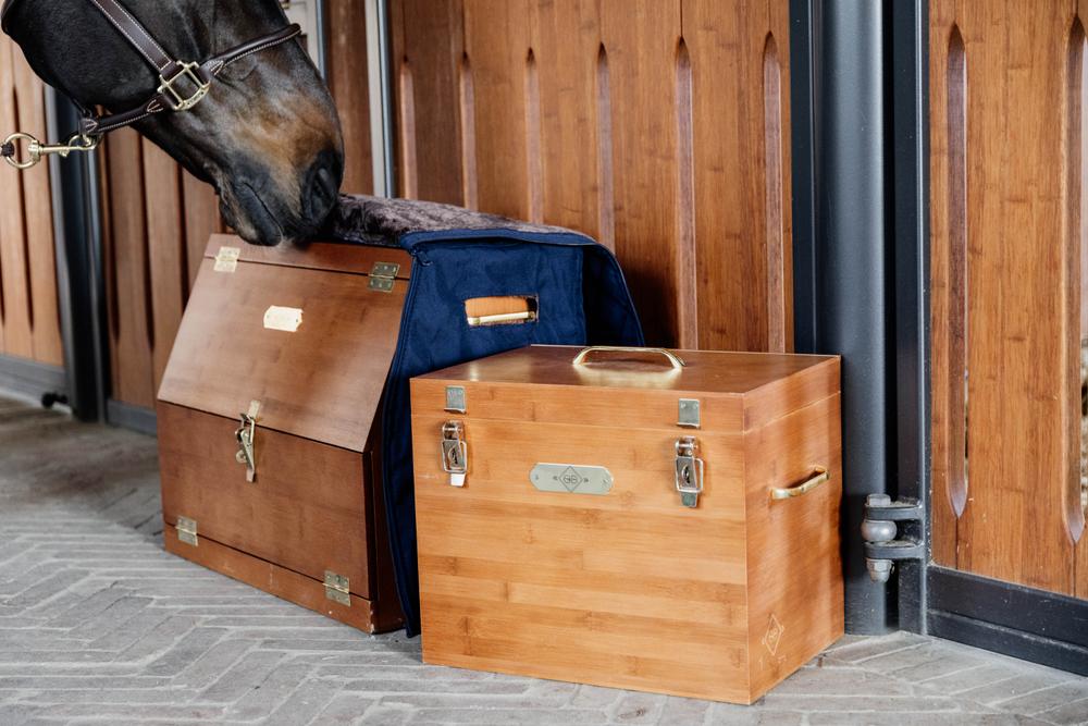 This Tack Box is ideal to store all your products and grooming equipment at shows or at home. It is 30cm high, 40cm wide and 28cm deep. The upper part opens and can be closed with two gold snap closures on which you can add a lock. Inside, you will find a big compartment (25x38x26 cm) which can be divided in two or three compartments thanks to 2 thin removable parts. You can organize the inside of your box your own way! It allows you to stock your spray bottles if needed. The box is made out of bamboo, which makes it extra resistant and super easy to clean. It is also very lightweight and comes with 3 gold handles so you can carry it everywhere. we do not recommend using the tack box as a stool.