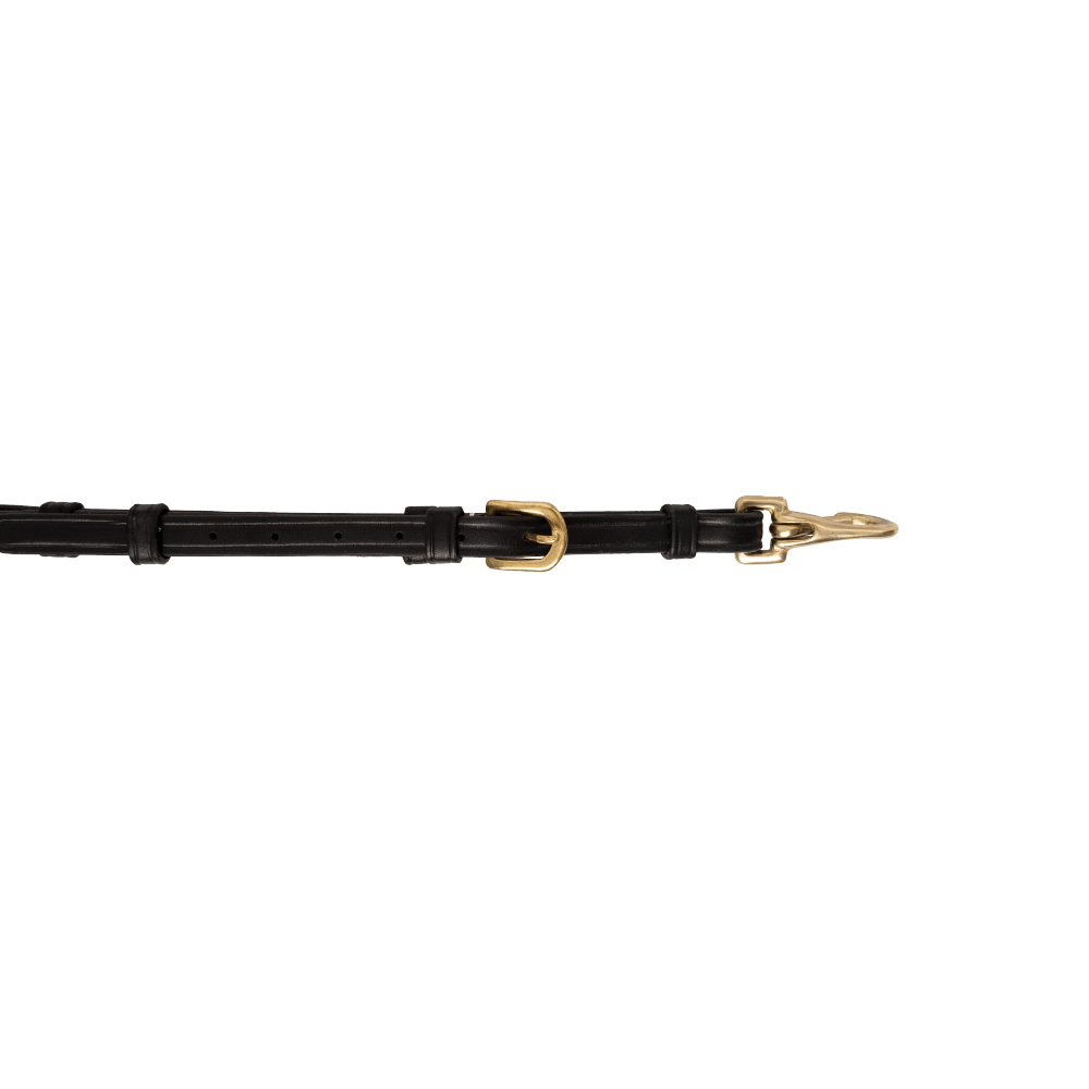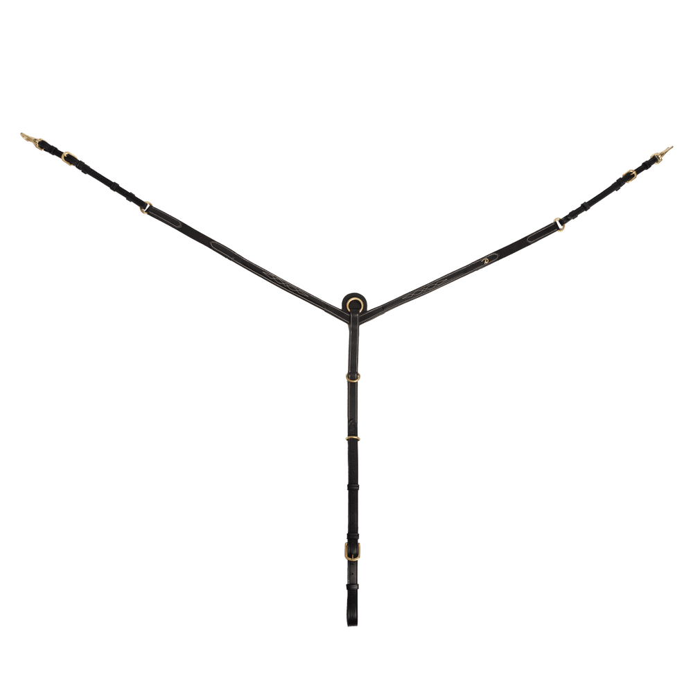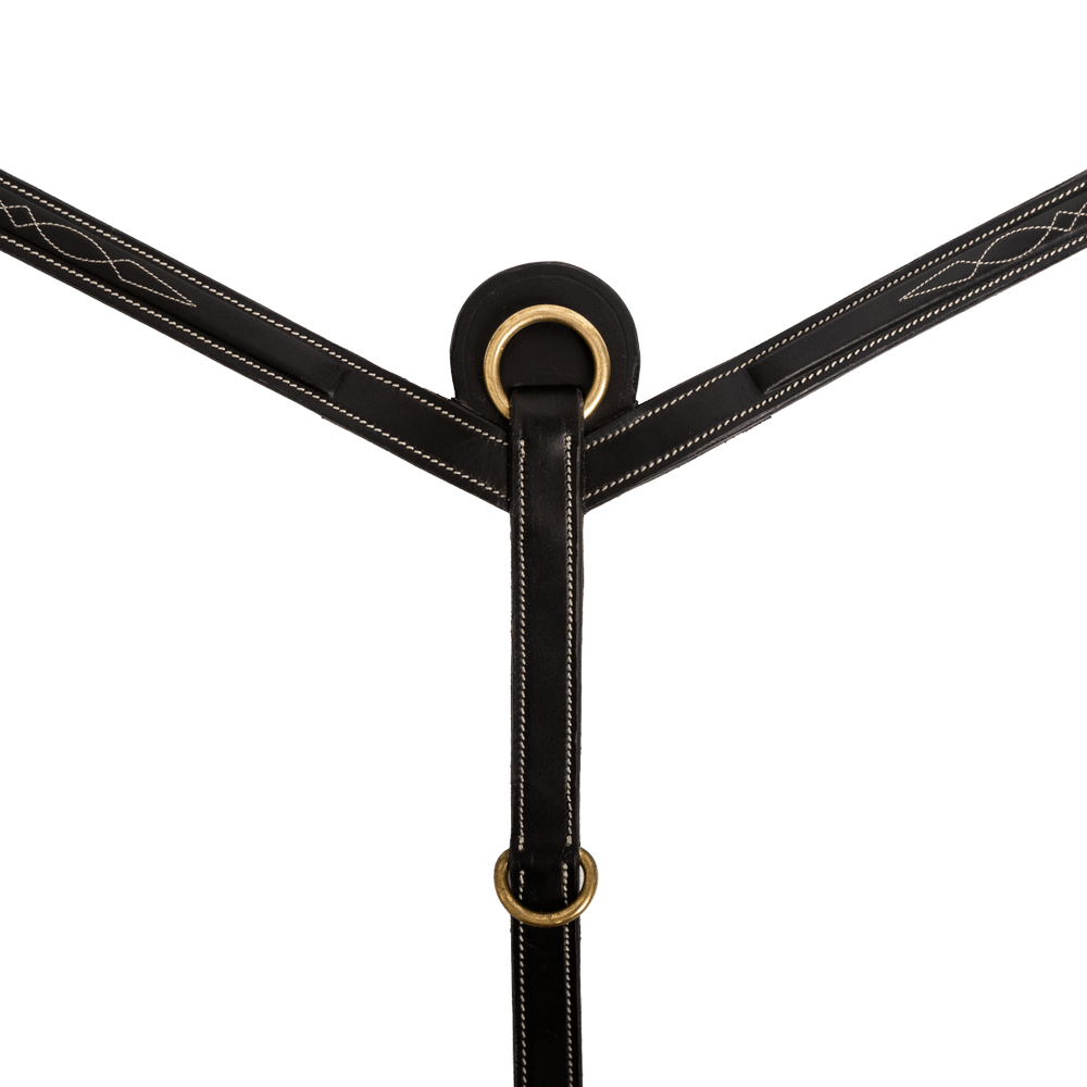 Breastplate in slightly square-raised leather with decorative topstitching Two additional dee rings for attaching draw or side reins 6 cm long elastic bands for comfort Snap hooks for attaching to the saddle