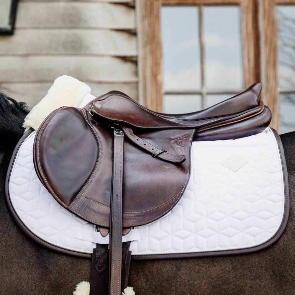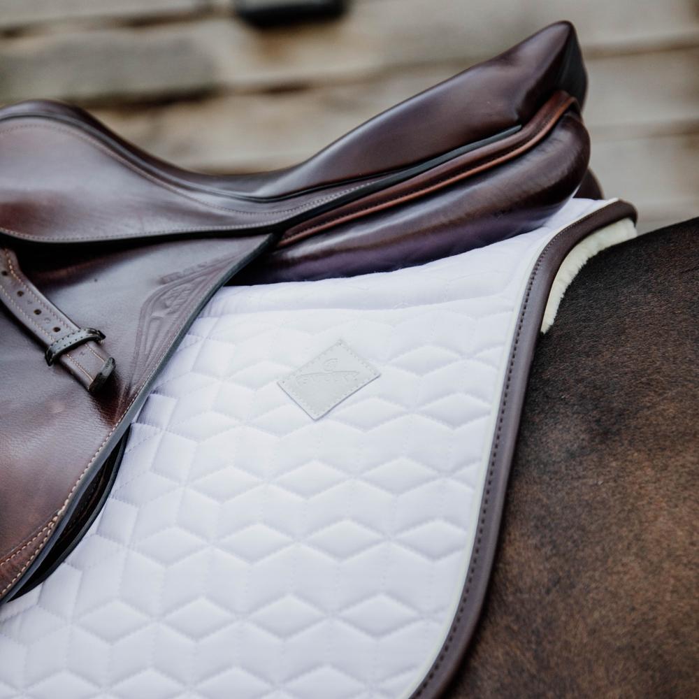 The artificial leather edge and white piping ensure a fancy look. This together with the fancy star quilting pattern makes this saddle pad unique. Because of the artificial sheepskin on the inside of the saddle pad and on the withers, this Skin Friendly Saddle Pad offers nothing but comfort. The subtle artificial leather logo is placed in a central, slightly higher place which always leaves space for embroidery of your own logo if desired.