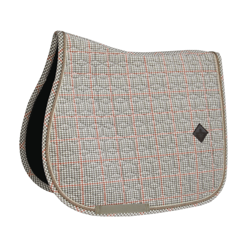 This saddle pad is printed with the Pied-de-Poule pattern, a fashion classic that brings rhythm and elegance, on a microfiber fabric. This saddle pad has a quilted star patten and a double twist piping in similar tones.