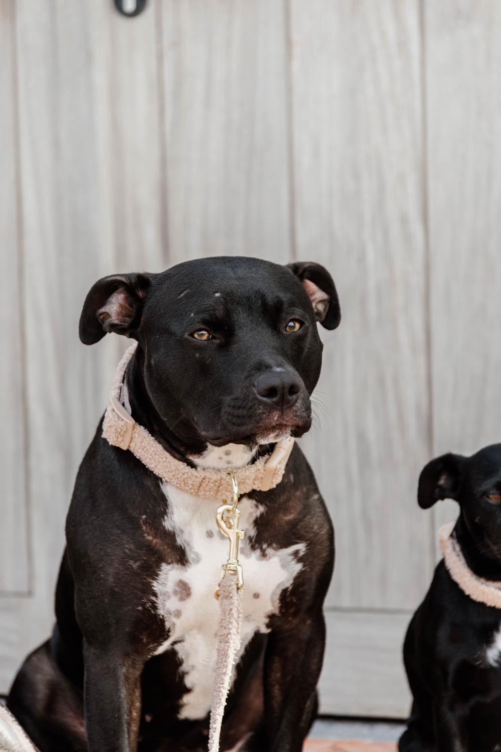 This dog collar has such a cute look on the outside because of the vegan teddy fleece material. On the inside, the collar is reinforced with nylon to assure comfort and extra strength. The dog collar features a gold ring to attach our matching dog lead.