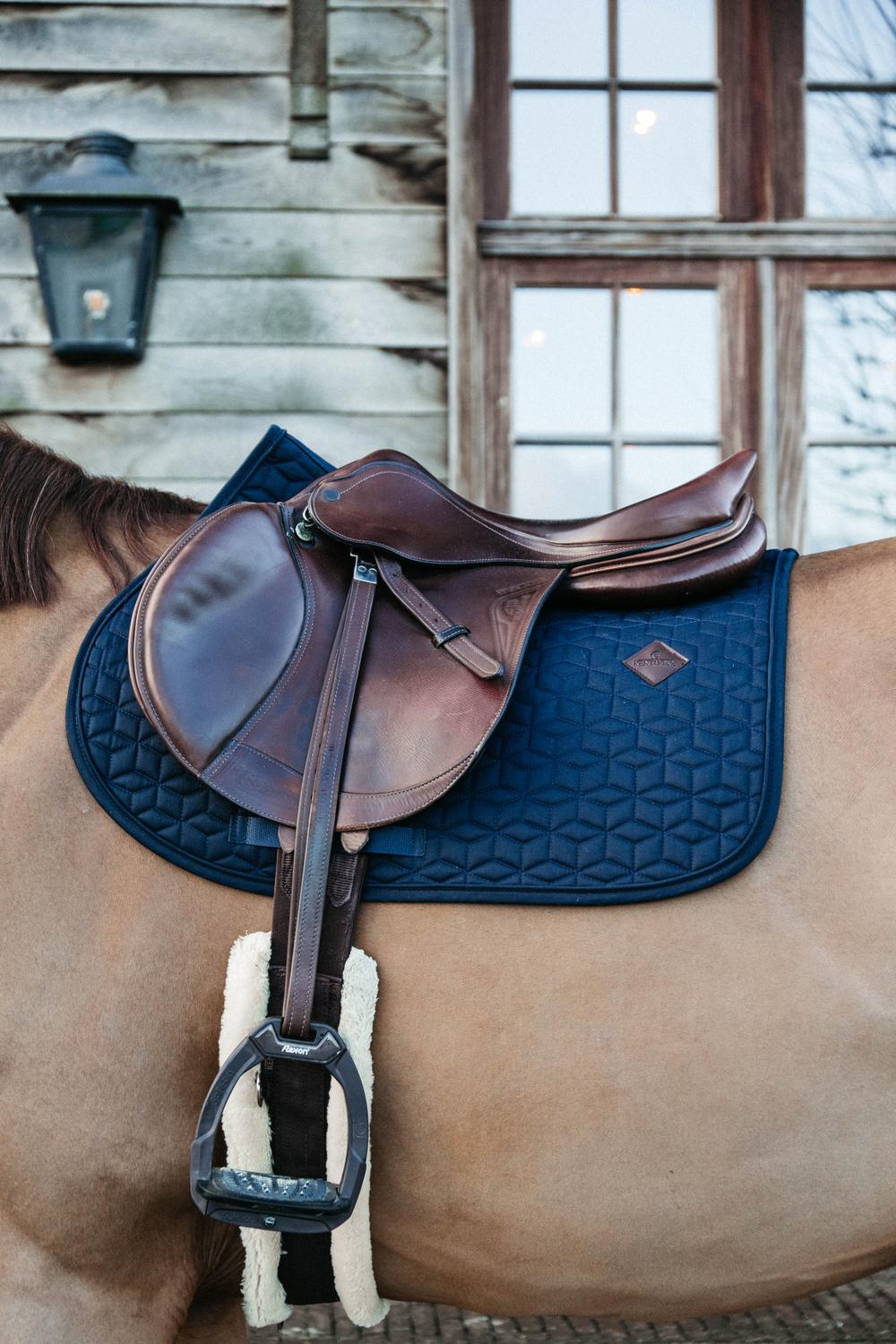 The outside of the saddle pad is made from a cotton-like polyester in a chic cube quilting design. On the left side of the saddle pad is a small vegan leather patch with the Kentucky logo, under the logo there’s enough space for embroidery. The lining of the saddle pad is a moisture-wicking cotton-polyester mix.