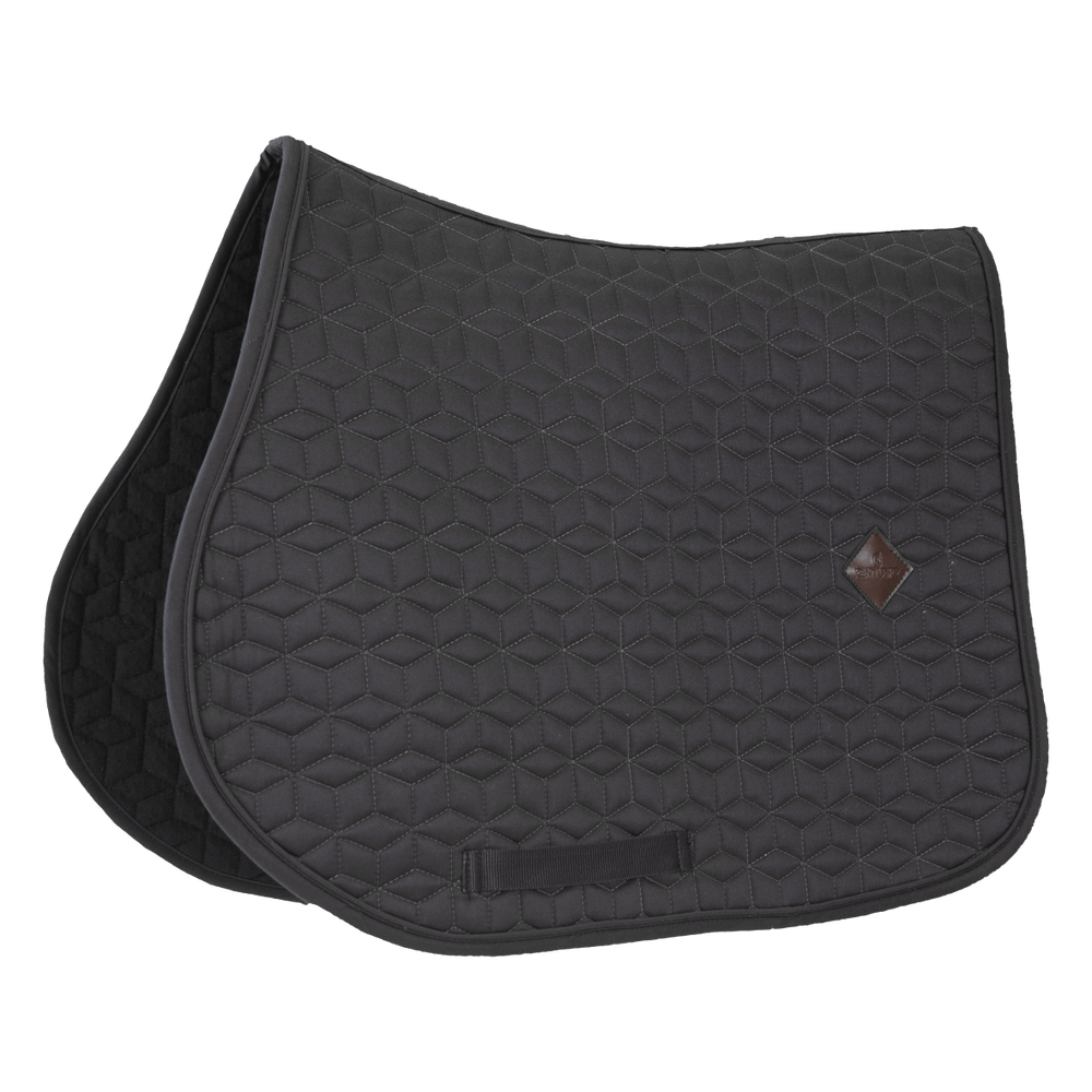 The outside of the saddle pad is made from a cotton-like polyester in a chic cube quilting design. On the left side of the saddle pad is a small vegan leather patch with the Kentucky logo, under the logo there’s enough space for embroidery. The lining of the saddle pad is a moisture-wicking cotton-polyester mix.