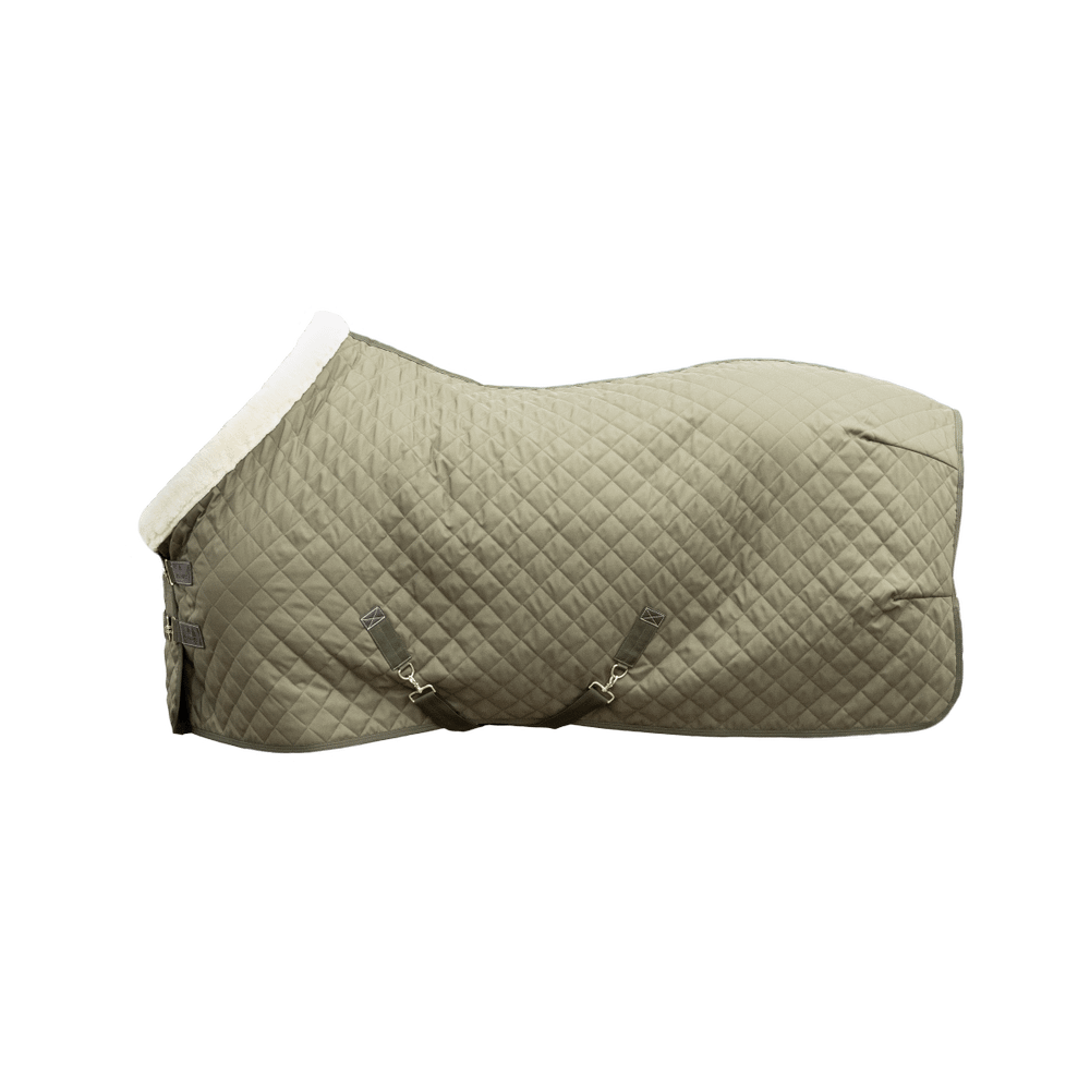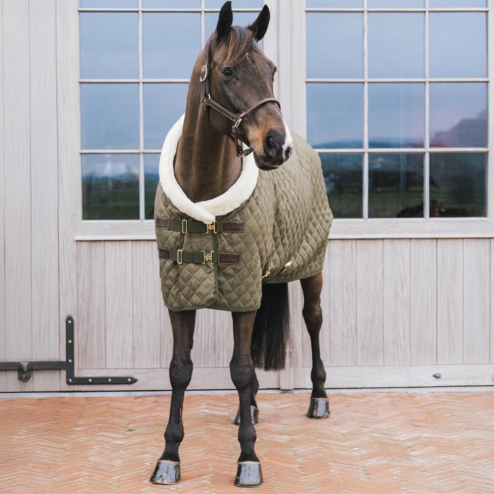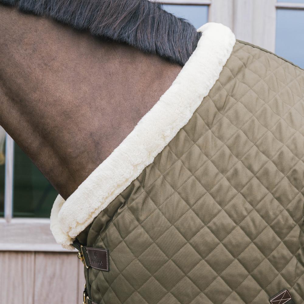 The Show Rug is made from 600D high tenacity polyester with a classy yet timeless diamond quilting. This makes it incredibly hard to tear the rug and avoids that shavings stick to the rug. To prevent pressure on the shoulder and wither area, the collar of the Show Rug is made from our popular artificial sheepskin. Next to a fancy look, the artificial sheepskin is also much more comfortable. For example, when the horse is eating the rug will not cut into the chest. The rug has a 160g fiberfill filling, which has the same performance as down but does not absorb any smell. To avoid rubbing marks, the rug is lined with our signature artificial rabbit skin. This fabric is extremely soft and creates a shiny effect on the horse’s coat. On top of that, the artificial rabbit skin creates tiny pockets of air. These pockets trap and retain the horse’s body heath causing an extra isolating layer. The combination of the materials creates a very breathable rug with a high warmth-to-weight ratio.